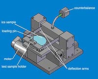 How the Tribometer works The Tribometer is a device for measuring the friction between two samples. The Edinburgh Tribometer has been specially designed and built to be as flexible as possible. The test sample, in this case a specimen of rubber, is mounted underneath the test sample holder. This is held in place by the deflection arms, which have strain gauges attached to them during the experiments. The strain gauges measure the amount of movement of the deflection arms, which is caused by the friction as the two samples rub together. The weight on the test sample holder can be changed by adding weights to the loading pin. In this way, experiments using different loadings can be performed. The ice sample is mounted in a circular tray that is connected to the motor. When the two samples are brought into contact and the motor turned on, the ice sample rotates and the samples rub together. At the conclusion of the experiment, the samples are examined to see the kind of 'wear surfaces' that have been produced. Community Email This Article Comment On This Article Related Links Engineering and Physical Sciences Research Council SpaceDaily Search SpaceDaily Subscribe To SpaceDaily Express Space Technology News - Applications and Research