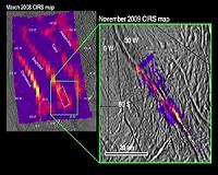 Zooming In On Heat At Baghdad SulcusPasadena CA (JPL) Feb 24, 2010 The right-hand image shows a dramatically improved view of heat radiation from a warm fissure near the south pole of Saturn's icy moon Enceladus. It was obtained by NASA's Cassini spacecraft during its Nov. 21, 2009, flyby of that moon. The fissure, named Baghdad Sulcus, is one of four so-called "tiger stripe" features that emit jets of water vapor and ice particles. The tiger stripe runs ... read more |