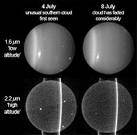 Louisville KY (SPX) Nov 11, 2004 As summer draws to a close in the southern hemisphere of Uranus, storm clouds are brewing in the upper atmosphere, northern hemisphere winds are gusting to 250 miles per hour, and the planet's rings are getting brighter every day. This weather report comes from researchers using the Keck II 10-meter telescope atop Mauna Kea volcano in Hawaii, where recent observations are proving that Uranus is not the "boring and unchanging" planet people have assumed, according to Imke de Pater, professor of astronomy at the University of California, Berkeley. The new images were obtained with the second-generation Near Infrared Camera (NIRC2) using the adaptive optics system on the Keck II telescope. "It's really intriguing, the planet seems to be getting more active as the equinox approaches," said de Pater, who, with colleague Heidi B. Hammel of the Space Science Institute in Boulder, Colo., has been observing Uranus since 2000 with adaptive optics on the Keck II telescope. "When the Voyager 2 spacecraft flew by Uranus in 1986, it saw almost no discrete cloud activity � you could literally count the number of discrete clouds on your fingers: 10! Most astronomers decided that Uranus was a boring, static planet," Hammel added. "What we are seeing now is the opposite, that actually there are changes, and they are visible to Keck and the Hubble Space Telescope." The team also spotted an inner ring, the 11 th, that was seen only once before � in a single image taken by Voyager. Really a sheet of rocky debris, the ring � called 1986U2R � is the innermost of the 11, calculated by the team to be about 3500 kilometers (2,200 miles) wide and centered about 39,600 kilometers (24,600 miles) from the planet core. Though a thousand times dimmer than the brightest ring � the epsilon ring � the inner ring is now visible because it is nearly edge-on to the sun and Earth, and so reflects more light back to Earth observers. The team also found that the nine main rings of Uranus consist of a single layer of particles, a so-called monolayer, never before seen in other rings. De Pater, Hammel and colleague Seran Gibbard of Lawrence Livermore National Laboratory report their observations this week at the American Astronomical Society's Division for Planetary Sciences meeting, which is being held Nov. 8-12 in Louisville, Ky. De Pater and Hammel also will discuss their findings at a media briefing on Nov. 10 at 12 noon. Additional members of the atmospheric team are Wes Lockwood of Lowell Observatory in Flagstaff, Ariz., and Kathy Rages of the SETI Institute in Mountain View, Calif. The Voyager 2 spacecraft made the first close-up observations of Uranus when it flew by the planet 18 years ago. At that time, the planet was at the peak of its southern summer, with the entire southern hemisphere bathed in continuous sunlight. The spacecraft observed faint, low-altitude bands around the planet, a faint echo of the colorful bands on Jupiter and Saturn, plus just 10 discrete clouds in the sunlit southern hemisphere compared with Jupiter's thousands and Saturn's hundreds. The relatively static atmosphere led some astronomers to label Uranus a dull and uninteresting planet, theorizing that the thick haze covering the planet's southern hemisphere somehow set up a stratified atmosphere that inhibited convection. The bands and clouds are thought to be made of crystals of methane condensing in the planet's atmosphere, which is mostly hydrogen and helium. Astronomers predict that the atmosphere surrounds a core of rock, surrounded by water, ammonia and methane slush . The Voyager spacecraft also measured the length of the Uranian day � 17 hours, 14 minutes in Earth time � based on the rotation of the planet's magnetic field. Starting in 1994, observations by the Hubble Space Telescope and later by Keck have shown that the banded structure near the southern pole has been evolving very slowly. Also, in the northern hemisphere, bright high-altitude clouds have been popping up ever since sunlight started to reach north of the equator. Now, for the first time, de Pater, Hammel and Gibbard have observed high-altitude cloud activity in the planet's southern hemisphere, indicating "vigorous convection" in the atmosphere. Convection � the turbulent upward and downward movement of large masses of air � creates clouds on Uranus just as it does on Earth. "One of several large clouds in the southern hemisphere surprised us by showing a very bright core. This bright core was also visible at a wavelength of 2.2 microns, which normally shows a very dark planet due to absorption by methane," said de Pater. "We have never seen such vigorous convective activity in the southern hemisphere before. We think this might be a response to the changing geometry, because this region of Uranus now experiences both day and night, whereas during the Voyager flyby it was always in sunlight." Hammel referred to the bright cloud feature as "Fourth of July fireworks," because they first surprised the team on July 4 and then faded below detectable levels by the 9 th of July. Other astronomers could not detect the feature when looking at Uranus a few days later. "Thus, this is the first time southern features have penetrated upward high enough to be detected at these wavelengths," Hammel explained. "Clouds are not unprecedented in this hemisphere, but penetration of these clouds' activity to higher altitudes is unprecedented." The beginning of autumn in the planet's southern hemisphere and the arrival of spring in the north is a sight never before seen with high-resolution telescopes like the Keck, since it occurs only once every 84 Earth years as the planet trundles around the Sun. As the 2007 equinox draws closer, churning activity is starting at high altitudes in the southern hemisphere . "The amount of sunlight hitting different parts of the planet is changing as Uranus moves around the Sun and presents different fac