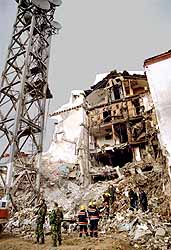 Washington - October 15, 1999 - Enemy forces will have a harder time hiding from U.S. air power in the future as new research projects prove effective in identifying hidden, moving targets.Despite the sophistication of U.S. surveillance and intelligence systems, three classes of targets are still troublesome for U.S. air forces. These include moving targets, mobile surface-to-air missile radar sites, and camouflaged targets. Without putting a human eye on these targets, they often remain elusive and cannot be destroyed. Caption: Yugoslav soldiers and Belgrade rescue workers search through the rubble at the Serbian television building trying to find more survivors in the basement. The building was intentionally targeted for NATO air strikes on April 23 resulting in the death of over 10 journalists and technichans. Photo Copyright AFP The Defense Advanced Research Agency has launched a technical assault to lift the fog of war surrounding these targets and replace it with a clear picture of what and where enemy forces are located at any given moment in time. Specifically, the agency's research efforts are focused on: