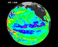 Pasadena CA (SPX) Apr 24, 2008 Boosted by the influence of a larger climate event in the Pacific, one of the strongest La Ninas in many years is slowly weakening but continues to blanket the Pacific Ocean near the equator, as shown by new sea-level height data collected by the U.S.-French Jason oceanographic satellite. This La Nina, which has persisted for the past year, is indicated by the blue area in the center of the image along the equator. Blue indicates lower than normal sea level (cold water). The data were gathered in early April. The image also shows that this La Nina is occurring within the context of a larger climate event, the early stages of a cool phase of the basin-wide Pacific Decadal Oscillation. The Pacific Decadal Oscillation is a long-term fluctuation of the Pacific Ocean that waxes and wanes between cool and warm phases approximately every five to 20 years. In the cool phase, higher than normal sea-surface heights caused by warm water form a horseshoe pattern that connects the north, west and southern Pacific, with cool water in the middle. During most of the 1980s and 1990s, the Pacific was locked in the oscillation's warm phase, during which these warm and cool regions are reversed. A La Nina is essentially the opposite of an El Nino. During El Nino, trade winds weaken and warm water occupies the entire tropical Pacific Ocean. Heavy rains tied to the warm water move into the central Pacific Ocean and cause drought in Indonesia and Australia while altering the path of the atmospheric jet stream over North and South America. During La Nina, trade winds are stronger than normal. Cold water that usually sits along the coast of South America is pushed to the middle of the equatorial Pacific. A La Nina changes global weather patterns and is associated with less moisture in the air, and less rain along the coasts of North and South America. "This multi-year Pacific Decadal Oscillation 'cool' trend can intensify La Nina or diminish El Nino impacts around the Pacific basin," said Bill Patzert, an oceanographer and climatologist at NASA's Jet Propulsion Laboratory, Pasadena, Calif. "The persistence of this large-scale pattern tells us there is much more than an isolated La Nina occurring in the Pacific Ocean." Sea surface temperature satellite data from the National Oceanic and Atmospheric Administration also clearly show a cool Pacific Decadal Oscillation pattern The shift in the Pacific Decadal Oscillation, with its widespread Pacific Ocean temperature changes, will have significant implications for global climate. It can affect Pacific and Atlantic hurricane activity, droughts and flooding around the Pacific basin, marine ecosystems and global land temperature patterns. "The comings and goings of El Nino, La Nina and the Pacific Decadal Oscillation are part of a longer, ongoing change in global climate," said Josh Willis, a JPL oceanographer and climate scientist. Sea level rise and global warming due to increases in greenhouse gases can be strongly affected by large natural climate phenomenon such as the Pacific Decadal Oscillation and the El Nino-Southern Oscillation. "In fact," said Willis, "these natural climate phenomena can sometimes hide global warming caused by human activities. Or they can have the opposite effect of accentuating it." Jason's follow-on mission, the Ocean Surface Topography Mission/Jason-2, is scheduled for launch this June and will extend to two decades the continuous data record of sea surface heights begun by Topex/Poseidon in 1992. JPL manages the U.S. portion of the Jason mission for NASA's Science Mission Directorate, Washington, D.C. Community Email This Article Comment On This Article Related Links NASA's ocean surface topography missions Pacific Decadal Oscillation El Nino, La Nina and an Ocean called Pacifica