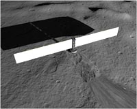 An artist's concept of a fission surface power system on the surface of the moon. The nuclear reactor has been buried below the lunar surface to make use of lunar soil as additional radiation shielding. The engines that convert heat energy to electricity are in the tower above the reactor, and radiators extend out from the tower to radiate into space any leftover heat energy that has not been converted to electricity. The power system would transmit a steady 40 kW of electric power, enough for about eight houses on Earth, to the lunar outpost. Credit: Courtesy NASA
