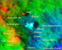 Pasadena CA (JPL) Jan 11, 2007 The high-resolution camera on NASA's Mars Reconnaissance Orbiter has imaged the 1997 landing site of NASA's Mars Pathfinder, revealing new details of hardware on the surface and the geology of the region. Pathfinder landed on July 4, 1997, and transmitted data for 12 weeks. Unlike the two larger rovers, Spirit and Opportunity, currently active on Mars, Sojourner could communicate only with the lander, not directly with Earth. The Pathfinder mission's small rover, Sojourner, appears to have moved closer to the stationary lander after the final data transmission from the lander, based on tentative identification of the rover in the image. The lander's ramps, science deck and portions of the airbags can be discerned in the new image. The parachute and backshell used in the spacecraft's descent lie to the south, behind a hill from the viewpoint of the lander. Four bright features may be portions of the heat shield. Rob Manning, Mars program chief engineer at NASA's Jet Propulsion Laboratory, Pasadena, said, "The new image provides information about Pathfinder's landing and should help confirm our reconstruction of the descent as well as give us insights into the landing and the airbag bounces." Dr. Alfred McEwen of the University of Arizona, Tucson, principal investigator for the High Resolution Imaging Science Experiment, said "Pathfinder's landing site is one of the most-studied places on Mars. Making connections between this new orbital image and the geological information collected at ground level aids our interpretation of orbital images of other places."