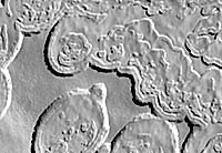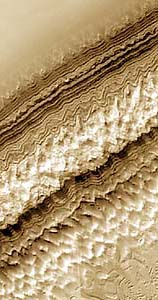 San Diego - April 11, 2000 - The layered terrains of the Martian polar regions are among the most exotic planetary landscapes in our Solar System. The layers exposed in the south polar residual cap, provide a vivid detail of the climate history of Mars over the last 100 million years or so. The materials that comprise the south polar layers may include frozen carbon dioxide, water ice, and fine dust. In the lower left of the image a complex erosional pattern has developed on the south polar cap, perhaps by a combination of sublimation, wind erosion, and ground-collapse. Because the south polar terrains are so strange and new to human eyes, no one (yet) has entirely adequate explanations as to what is being seen. These images were acquired by the Mars Orbiter Camera aboard the Mars Global Surveyor spacecraft during the southern spring season in October 1999.