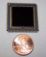 Greenbelt - Mar 3, 2003 The world's first one million-pixel Quantum Well Infrared Photodetector (QWIP) array has been fabricated and tested by a NASA-led team. The new detector promises to be a low-cost alternative to conventional infrared detector technology for a wide range of scientific and commercial applications. "We are excited about the many potential applications for NASA's QWIP technology," said Dr. Murzy Jhabvala, chief engineer of NASA Goddard Space Flight Center's Instrument Technology Center. The development effort was led by the Instrument Systems and Technology Center at NASA Goddard, Greenbelt, Md. The Army Research Laboratory (ARL), Adelphi, Md., was instrumental in the design and fabrication of the QWIP array and the Rockwell Science Center, Camarillo, Calif., provided the silicon readout and hybridization. Engineers at NASA's Jet Propulsion Laboratory (JPL), Pasadena, Calif., also participated in the project. The new array was fabricated in Goddard's Detector Development Laboratory and tested at both Goddard and the ARL. Infrared light is invisible to the human eye, but some types are generated by and perceived as heat. A conventional infrared detector has a number of cells (pixels) that interact with an incoming particle of infrared light (an infrared photon) and convert it to an electric current that can be measured and recorded. They are similar in principle to the detectors that convert visible light in a digital camera. The more pixels that can be placed on a detector of a given size, the greater the resolution, and NASA's latest QWIP array is a significant advance over earlier 300,000-pixel QWIP arrays, previously the largest available. NASA's new QWIP detector is a Gallium Arsenide (GaAs) semiconductor chip with 60 to 100 layers of detector material on top. Each layer is extremely thin, about 500 atoms thick, and the layers are designed to act as quantum wells. Quantum wells employ the bizarre physics of the microscopic world, called quantum mechanics, to trap electrons, the fundamental particles that carry electric current, so that only light with a specific energy can release them. If light with the correct energy hits one of the quantum wells in the array, the freed electron flows through a separate chip above the array, called the silicon readout, where it is recorded. A computer uses this information to create an image of the infrared source. Quantum wells can be designed to detect light with different energy levels by varying the composition and thickness of the detector material layers. Thus, a detector using quantum well technology can be made to sense light (in this case, infrared) with a wide range of energy levels. This is called a broadband detector. "The advantages of GaAs QWIP technology over other infrared detector technologies is the relative ease of fabrication which translates to low production costs and high yield, the ability to spectrally tune the infrared response of the detector over a broad portion of the infrared region (3-18 microns), the very high pixel-to-pixel uniformity and the almost non-existent low frequency (1/f) noise," said Jhabvala. This work was conceived for, and funded by NASA Goddard. The team has recently been selected to develop a broadband (8-14 micrometers) one million-pixel QWIP array-based imaging system as part of the Advanced Component Technology (ACT) development for NASA;s Earth Science Technology Office (ESTO). The initial development of a prototype narrowband one million-pixel QWIP array is a critical first step that significantly contributes to the feasibility of building a broadband far-infrared QWIP camera system under the ESTO program. "The spectral response of the prototype array was between 8.4 and 9.0 micrometers and achieved background limited performance at an operating temperature of 76 Kelvin (minus 197 degrees Celsius or minus 323 degrees Fahrenheit). Numerous imaging experiments (f/2 lens) were performed at the ARL and we are continuing to improve the detector fabrication processes and the detector performance," said Jhabvala.