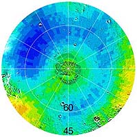 Los Alamos - Jun 03, 2002 Researchers with the Department of Energy's Los Alamos National Laboratory have determined that Mars has enough water to sustain human exploratory missions. A neutron spectrometer, designed and built at Los Alamos and flown aboard NASA's Mars Odyssey, has been mapping the Red planet for the past three months for hydrogen, an indicator of water-ice. This week Bill Feldman, Los Alamos' principal investigator for the neutron spectrometer, unveils data and detailed maps of the hydrogen-rich Martian terrain at the American Geophysical Union conference in Washington D.C. The results were published in the May 31 issue of Science magazine. "The surface soils of Mars are rich in hydrogen," said Feldman. "Soil extending 60 degrees from the Martian poles contain from 35 percent to 100 percent of water-ice buried beneath a shallow overburden of hydrogen-poor soil. "Although scientists have known that water ice is stable close to the surface in these regions, our new measurements are the first to give the amount of near-surface water on Mars. "The amount of water present on Mars is sufficiently large that it can support future human exploration activities," Feldman explained. "We have anticipated these results for 17 years and are excited that all of our wishes and hard work have been fulfilled." The neutron spectrometer maps show that the large region that extends from the poles to within about 50 degrees of the equator contains Mars' most abundant reservoirs of hydrogen, or water ice. The large expanses at low to middle latitudes of Mars also contain significant amounts of hydrogen, which are most likely deposits of chemically and/or physically bound water and/or hydroxyl radicals -- one hydrogen atom bound to one oxygen atom. The neutron spectrometer data are supported by simultaneous measurements made using Mars Odyssey's gamma-ray spectrometer, operated by the University of Arizona. Los Alamos' neutron spectrometer began mapping the Martian surface while it was summer in the south and winter in the north. It revealed the extent to which the northern and southern polar caps are covered in a thick layer of carbon dioxide, or dry ice. During winter, the carbon dioxide layers extend from the poles to within about 60 degrees of the equator because the dry ice frost settles out of the atmosphere when temperatures fall about 186 degrees below zero Fahrenheit. During the warmer summer the carbon dioxide layer evaporates completely in the north but remains as a thick cover of the residual polar cap in the south. The first successful attempt to measure the global distribution of neutrons about a planetary body was made using a similar neutron spectrometer aboard Lunar Prospector. Comparisons between the lunar and Martian neutron spectrometer data reveal that Mars' soil is richer in hydrogen than is the moon's soil by more than several factors of 10 to several factors of 1,000. Los Alamos neutron spectrometer will continue to measure neutrons that leak outward from the upper meter of the Martian soil for several more years. Mars Odyssey's orbit is such that the entire planet's surface is sampled in four-degree longitudinal increments weekly. Scientists will use these data not only to determine the amount of water on Mars, but to map the basaltic lava cover, measure the seasonal variation of dry-ice frost that covers both poles during their winter months and help interpret data from the gamma-ray spectrometer to determine the quantity and composition of the most abundant elements on the planet. Los Alamos National Laboratory is operated by the University of California for the National Nuclear Security Administration (NNSA) of the U.S. Department of Energy and works in partnership with NNSA's Sandia and Lawrence Livermore national laboratories to support NNSA in its mission. Los Alamos enhances global security by ensuring safety and confidence in the U.S. nuclear stockpile, developing technologies to reduce threats from weapons of mass destruction and improving the environmental and nuclear materials legacy of the cold war. Los Alamos' capabilities assist the nation in addressing energy, environment, infrastructure and biological security problems. Community Email This Article Comment On This Article Related Links More Pixs at Los Alamos Odyssey at JPL SpaceDaily Search SpaceDaily Subscribe To SpaceDaily Express Mars News and Information at MarsDaily.com Lunar Dreams and more