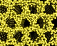 Washington DC (SPX) Jul 15, 2008 For 5,000 years the only way to shape metal has been by the "heat and beat" technique. Even with modern nanotechnology, metalworking involves carving metals with electron beams or etching them with acid. Now Cornell researchers have developed a method to self-assemble metals into complex configurations with structural details about 100 times smaller than a bacterial cell by guiding metal particles into the desired form using soft polymers. "I think this is ingenious work that takes the fundamental concepts of polymer science and applies them to make metals in a totally novel way," said Andrew Lovinger, the director of the Polymers Program at the National Science Foundation. "In so doing, it opens the door to all kinds of new possibilities." Applications include making more efficient and cheaper catalysts for fuel cells and industrial processes, and creating "plasmonic" surface structures capable of carrying more information across microchips than conventional wires do. "The polymer community has tried to do this for almost 20 years," said Uli Wiesner, Cornell professor of materials science and engineering, who reports on the new method in the June 27, 2008, issue of the journal Science. "But metals have a tendency to cluster into uncontrolled structures." Wiesner's research team has now developed a method to overcome this globby inclination of metals. First, metal nanoparticles measuring about 2 nanometers (nm) or 10-20 atoms in diameter, are coated with an organic material known as a ligand. The ligands form thin jackets around the metal atoms, changing their surface chemistry. Keeping the ligand jackets thinly tailored is a key factor that permits the volume of metal in the final structure to be large enough to hold its shape when the organic materials are eventually removed. The jacketed metal atoms are then put in a solution containing block co-polymers, a kind of nano-scaffolding material. The innovative use of the ligands allows for the metal nanoparticles to be dissolved--even at high concentrations--in such a solution. A block co-polymer is made up of two different long chains, or blocks, of molecules linked together to form a predictable pattern. In the experiment, depicted in the illustration at right, ligand-coated platinum nanoparticles (shown as blue and gray balls) are nestled amongst the block co-polymers (shown as blue and green strands). After the ligand-coated nanoparticles and polymers assemble in regular patterns, the material is heated to high temperatures in the absence of air to convert the polymers to a carbon scaffold. The scaffold is then allowed to cool. Because the metal nanoparticles have a very low melting point, without the carbon scaffold they would stubbornly fuse together in an uncontrolled fashion. Using this process, the carbon scaffold can be etched away with an acid, leaving behind a structured solid metal. The Cornell group used the new method to create a platinum structure (see illustration above) with uniform hexagonal pores, each on the order of 10 nm across--a much larger diameter than previous attempts have been able to produce. Platinum is, so far, the best available catalyst for fuel cells, and a spacious pore structure allows fuel to flow through and react over a larger surface area. "It opens a completely novel playground because no one has been able to structure metals in bulk ways using polymers," Wiesner explained. "In principle, if you can do it with one metal you can do it with others or even mixtures of metals." In addition to making porous materials for catalysis, the researchers said, the technique could be used to create finely structured metals on surfaces, a key to transform the field of plasmonics, which studies the interactions among metal surfaces, light, and density waves of electrons, known as plasmons. Currently, researchers are investigating the use of plasmons to transmit more information across metal wires in microchips and to improve optics applications, like lasers, displays, and lenses. The research team was led by Uli Wiesner at Cornell University and included Francis DiSalvo, the J.A. Newman Professor of Chemistry and Chemical Biology, and Sol Gruner, the John L. Wetherill Professor of Physics, both at Cornell, and other undergraduate and graduate students. The research was funded by the National Science Foundation and the Cornell Fuel Cell Institute. Community Email This Article Comment On This Article Share This Article With Planet Earth