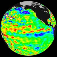 Greenbelt - Apr 21, 2004 While listening to your local weatherman during the past several years, you've probably heard the terms "El Nino" and "La Nina" hundreds of times, both major players in our weather. El Nino marks a warming of the waters in the tropical Pacific, every 3 to 7 years, that touches off a set of weather consequences, often including heavy rains and flooding across the western and southern United States. La Nina is best characterized as El Nino's opposite, a condition in which sea-surface temperatures in the eastern tropical Pacific are lower than normal, creating its own unique train of atmospheric events. But, there are many other things going on in Earth's oceans that affect our weather. One is the Pacific Decadal Oscillation (PDO), first coined by researchers at the University of Washington in 1996 and now described as a long-lived El Nino-like pattern of Pacific climate variability, because both have similar climate fingerprints. But, the PDO can last a great deal longer, 20 to 70 years, unlike El Nino or La Nina that typically persist less than 18 months. Also, while sea temperatures change most dramatically near the equator during El Nino or La Nina, the most drastic changes are typically seen in the North Pacific with the PDO. These shifts in location of cold and warm water in the Pacific alter the path of the jet stream, the conveyor belt for storms across the continent. Changes in the jet stream result in considerable, long-term changes in weather patterns. Recently, unusual atmospheric conditions, not consistent with the PDO or other phenomenon, have been observed in the North Pacific, leading some scientists to believe the ocean's full fury is still being underestimated, as it might possess another "climate-controller" in its arsenal.