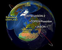 Pasadena CA (SPX) Feb 06, 2009 This artist's rendering shows a "family portrait" of Jason-1, Topex/Poseidon, and OSTM/Jason-2, all NASA satellites that collect data about sea surface heights around the world. Sea surface heights are one component helpful to hurricane forecasters, as higher seas indicate warmer waters (that power storms) while lower seas indicate cooler waters (such as those in La Nina events in the eastern Pacific). This image shows the position of all three satellites on January 28, 2009, as they descended to the southeast, passing over NASA's ground station just outside of Toulouse, France. Glenn M. Shirtliffe, Jason-1 Project Manager at NASA's Jet Propulsion Laboratory, Pasadena, Calif., where the satellites are managed, said, "As a result of the maneuvers performed on January 26 and 27, Jason-1 has now drifted well ahead of OSTM/Jason-2 and Topex/Poseidon, on its way to a new operational orbit on the other side of Earth, 162 degrees ahead of OSTM/Jason-2." The steamy and warm surface waters of the late-summer tropical oceans are the fuel that powers tropical cyclones. NASA's fleet of altimetry missions have often flown over these great storms, charting sea surface height (a measure of the subsurface thermal structure, or heat content). Warmer features like ocean eddies can cause these storms to intensify. Since the altimeters also measure the waves generated by these monster storms, as well as wind speeds, these measurements are routinely used in near-real-time wave and weather forecasts. Jason-1 completed its seventh year on orbit on December 7, 2008. From its vantage point 1,330 kilometers (860 miles) above Earth, this follow-on to the highly successful Topex/Poseidon mission has provided measurements of the surface height of the world's ocean to an accuracy of 3.3 centimeters (1.3 inches). This image from Jason-1 data shows sea surface height data around the world as of December 30, 2008. The purple and blue areas depict sea level heights (in millimeters "mm") lower than normal. One area is in the central Pacific Ocean, which indicates a La Nina event. The red areas indicate higher than normal sea surface heights. The Ocean Surface Topography Mission on the Jason-2 satellite (OSTM/Jason-2) is a follow-on to the Jason-1 mission. It launched June 20, 2008, from Vandenberg Air Force Base in California. "Topex/Poseidon was launched in August 1992 and during its first few days, flew over the monster Category 5 Hurricane Andrew, measuring wind and waves," said Bill Patzert, a JPL climatologist. "Our altimetry fleet was launched during a hurricane and has been chasing cyclones for more than 15 years." Topex/Poseidon is a joint venture between CNES and NASA to map ocean surface topography. Among its many achievements, Topex/Poseidon has measured sea levels with unprecedented accuracy to better than 5 centimeters (X inches), mapped year-to-year changes in heat stored in the upper ocean, and produced the most accurate global maps of tides ever. Share This Article With Planet Earth