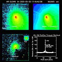 College Park MD (SPX) Jun 22, 2005 For the first time, scientists have processed images from NASA's Deep Impact spacecraft and clearly seen the solid body, or nucleus, of the comet through the vast cloud of dust and gas that surrounds it. The new images provide important information about the mission's target: the "heart" of comet Tempel 1. The images were taken at the end of May with the spacecraft's medium resolution camera, at a distance of some 20 million miles from the comet. Unprocessed, the images are dominated by the comet's huge cloud of dust and gas, which scientists call the coma. However, scientists used a neat photometric trick to isolate the relatively small (3-mile by 9-mile) nucleus from the comet's coma, or atmosphere. The much larger, but less dense atmosphere was mathematically identified and then subtracted from the original images leaving images of the nucleus, the bright point in the center of the coma. "Its exciting to see the nucleus pop out from the coma," said University of Maryland astronomer Michael A'Hearn, who leads the Deep Impact mission. "And being able to distinguish the nucleus in these images helps us to better understand the rotational axis of the comet's nucleus, which is helpful for targeting this elongated body." "This is an important milestone for the Deep Impact team," explained Carey Lisse, a member of the Deep Impact team and leader of the effort to extract views of the nucleus from the spacecraft images. "From here on in we just watch the nucleus grow and grow and become brighter and bigger as the spacecraft closes in on the comet. We detected the nucleus a lot sooner than expected, but now we'll be watching the nucleus all the way to impact!" As illustrated in the figure (shown), Deep Impact images taken on May 29-31 contain a well-formed coma with a detectable point source at the position of the brightest pixel. The brightness of the nucleus as determined from these images was close to that predicted from earlier observations with the Hubble and Spitzer space-telescopes and observations from large telescopes on the ground. At present, the nucleus contributes about 20 percent of the total brightness near the center of the comet. "The early detection of the nucleus in these images helps us to set the final exposure times for our encounter observations," said Michael Belton, deputy principal investigator for the Deep Impact Mission. "Next we need to determine, using additional nucleus detections, how the comet is rotating in space, so we can figure out what part we will hit on July 4th."