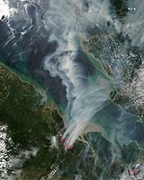 Greenbelt MD (SPX) Jun 29, 2005 A thick cloud of smoke pours from forest fires on the Indonesian island of Sumatra. Forest fires are common in Indonesia during the hot, dry months of the dry season, which runs from June to September. Hot, dry weather and winds blowing from the southwest help fires explode in Indonesia's forests, and such conditions probably fed the fires seen outlined in red in this image. The winds are also responsible for blanketing parts of Malaysia with smoke. In this image, a white plume of smoke snakes north and east from the fires, moving inland over northern Malaysia. Not only does the dense haze decrease visibility, posing a traffic hazard for both air and ground travel, but the smoke could cause serious health problems. The Moderate Resolution Imaging Spectroradiometer (MODIS) onboard NASA's Terra satellite acquired this image in the morning of June 25, 2005. By afternoon, the fires had grown to the point that the narrow Strait of Malacca that separates Malaysia from Sumatra was barely visible. Unfortunately, clouds also partially obscured the view of the region. Community Email This Article Comment On This Article Related Links SpaceDaily Search SpaceDaily Subscribe To SpaceDaily Express Earth Observation News - Suppiliers, Technology and Application