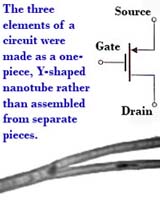 New York (UPI) Aug 16, 2005 Scientists for the first time have created a transistor made from carbon nanotubes alone, a development that could lead to more powerful computers than current versions employing conventional silicon transistors, experts told UPI's Nano World. "The applications would be an entirely new class of nanoelectronic devices," said lead researcher Prabhakar Bandaru, a materials scientist at the University of California, San Diego. Modern computers work by encoding data as a series of ones and zeros. This code is conveyed via transistors, which are minute switches that can either be flicked on or off to represent a one or a zero. The dramatic growth in the speed of electronics over time is due in large part to the steady drop in the size of transistors, which allows more and more to be crammed closer together. The problem: Shrinking the features of conventional electronics past 10 nanometers -- where distances are in the range of atoms -- is virtually impossible, because the electrons start to jump back and forth randomly. Based on Moore's law -- the chip industry's observed ability to double transistor density roughly every two years -- the 10-nanometer limit should arrive in roughly 15 years. Scientists have experimented with carbon nanotubes in transistors for the last 10 years. Prior attempts employed the nanotubes as channels for electrical current, with a separate component known as a gate made of silica and silicon that switched the current on and off. Bandaru and colleagues instead developed a carbon-nanotube transistor with the gate built into the device. They started with straight multi-walled nanotubes and mixed in iron-titanium particles that catalyzed the growth of additional tubes from the originals, much like branches from a tree.