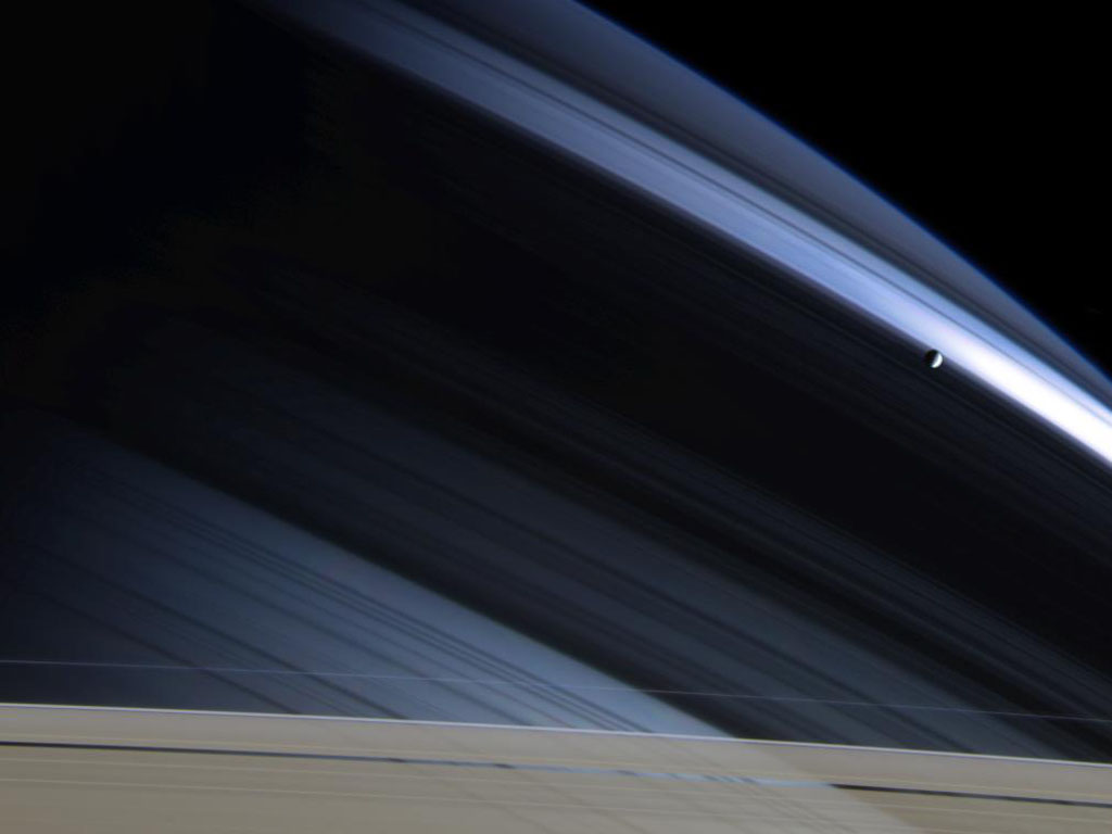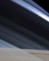 Pasadena CA (JPL) Nov 30, 2004 In a splendid portrait created by light and gravity, Saturn's lonely moon Mimas is seen against the cool, blue-streaked backdrop of Saturn's northern hemisphere. Delicate shadows cast by the rings arc gracefully across the planet, fading into darkness on Saturn's night side. The part of the atmosphere seen here appears darker and more bluish than the warm brown and gold hues seen in Cassini images of the southern hemisphere, due to preferential scattering of blue wavelengths by the cloud-free upper atmosphere. The bright blue swath near Mimas (398 kilometers, or 247 miles across) is created by sunlight passing through the Cassini division (4,800 kilometers, or 2,980 miles wide). The rightmost part of this distinctive feature is slightly overexposed and therefore bright white in this image. S Shadows of several thin ringlets within the division can be seen here as well. The dark band that stretches across the center of the image is the shadow of Saturn's B ring, the densest of the main rings. Part of the actual Cassini division appears at the bottom, along with the A ring and the narrow, outer F ring. The A ring is transparent enough that, from this viewing angle, the atmosphere and threadlike shadows cast by the inner C ring are visible through it. Images taken with red, green and blue filters were combined to create this color view. The images were obtained with the Cassini spacecraft narrow angle camera on Nov. 7, 2004, at a distance of 3.7 million kilometers (2.3 million miles) from Saturn. The image scale is 22 kilometers (14 miles) per pixel. Community Email This Article Comment On This Article Related Links SpaceDaily Search SpaceDaily Subscribe To SpaceDaily Express Explore The Ring World of Saturn and her moons Jupiter and its Moons The million outer planets of a star called Sol News Flash at Mercury
