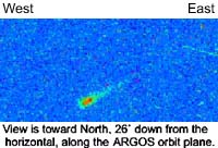 Washington - February 16, 2000 - Scientists from the Naval Research Laboratory (NRL) report that the first ever far-ultraviolet (UV) image of a meteor has been obtained by the Global Imaging Monitor of the Ionosphere (GIMI) instrument on board the DoD Space Test Program's Advanced Research and Global Observation Satellite (ARGOS). The image was taken on November 18, 1999, during the annual Leonid maximum, which in 1999, lasted from November 16 - 18. At the time of the exposure, the ARGOS spacecraft was about 20 deg south of the equator, over the south Pacific Ocean; however, the viewing direction (and the ARGOS altitude of 833 km) was such that the meteor itself was much closer to the equator. Dr. George Carruthers, NRL's GIMI principal investigator, reports the scientific significance of the observation, saying, "To our knowledge, this is the first observation of a meteor entry to the atmosphere in the far-UV spectral range. Such an entry cannot be observed from Earth's surface or from aircraft because of its absorption by the lower atmosphere. Ground- based observations of meteors cannot detect many of the important elements and compounds expected to be present in meteoroids." "The first observation from space of a meteor, by GIMI in UV light, adds another dimension to the handful of previous space observations of meteors," notes Dr. Noah Brosch of the Wise Observatory and the Department of Astronomy and Astrophysics at Tel Aviv University in Israel. Dr. Brosch explains, "Satellites view the Earth continuously and rarely detect extremely bright fireballs. These detections are mostly in the visible or near-infrared spectral domains. The GIMI observation is the first such space experiment to be done in the UV." Commenting on the practical application of this discovery, Brigadier General (sel) S. Pete Worden, USAF Deputy Director for Command and Control says, "As our civil, commercial and national security use of space continues to increase, natural phenomena that can disrupt satellite operations cause growing concern. "The Leonid meteor storm is such a phenomenon. NRL's impressive data promises to provide a unique new tool to understand the true composition and structure of these meteors. This is vital information if we are to predict and mitigate future meteor-induced problems to our space operations." Abundances of various elements and compounds found in meteors are known to be highly variable among the types of meteorites which have been recovered on the ground, but the latter are not representative of the range of meteoroids as expected to be present in the solar system, since only the most refractory and/or massive meteoroids survive entry to the atmosphere. Once we have an opportunity to analyze our data and examine other images for events of this type, says Carruthers, we may establish the feasibility of using far-UV spectroscopic instruments to more accurately measure the compositions of incoming meteoroids. Because Earth's lower atmosphere strongly absorbs far-UV radiation in the wavelength range observed by GIMI (131-200 nanometers, or 1310-2000 Angstroms), the scientific team estimates that in order to be observable, the meteor had to have been at an altitude well above 100 kilometers. Since its entry velocity was probably in excess of 60 km/sec (i.e. much higher than Earth escape velocity of 11.2 km/sec), the energy was probably available for producing emission in the far-UV at relatively high altitudes, due to excitation of the atmosphere and/or meteoric constituents. The most likely emission source, Dr. Carruthers says, is nitric oxide (NO) which is produced and excited by dissociation of molecular nitrogen and its subsequent reaction with atomic oxygen, producing emission in the 190-200 nm wavelength range. However, if the meteor is of carbonaceous composition, far-UV emissions of carbon monoxide (CO) and atomic carbon may be produced as well. GIMI is one of nine primary experiments on the ARGOS mission, which launched into a polar orbit on February 23, 1999 to study space weather. GIMI's principal objective is to obtain simultaneous wide-field FUV/EUV images of ionospheric and upper atmospheric emissions, covering large areas of the earth from a low-earth orbit. The GIMI images will be used to determine chemical densities [O+, nighttime O2, NO and N2] on a global basis and to detect disturbances in the ionosphere that are caused by auroral activity, gravity waves and foreign materials from meteors, suspected "ice comets," rocket exhausts and chemical releases. In between the atmospheric observations, GIMI is gathering data for an all-sky survey of stars and data on celestial diffuse sources at far-ultraviolet wavelengths. The GIMI instrument has two cameras for simultaneous observations of selected targets. Camera 1, which is sensitive in the 75-110 nm ranges is primarily being used for observations of the dayside ionosphere, auroras, and stellar occultations, and for star field surveys. Camera 2 is sensitive in the 131-160 and 131-200 nm far-UV wavelength ranges and is used for observations of the nightside ionosphere, airglow, stellar occultations, star field surveys, and also gas releases and rocket plumes at night.