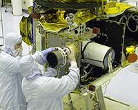 Mike Lynch of the Johns Hopkins University Applied Physics Laboratory and Benjamin Rodriguez of the Southwest Research Institute re-install the Solar Wind Around Pluto (SWAP) instrument on NASA's New Horizons spacecraft Oct. 5 at Kennedy Space Center, Fla. SWAP, one of seven instruments on the Pluto-bound New Horizons probe, had been removed for previously planned maintenance and installation of new detectors. Visible above SWAP is the Pluto Energetic Particle Spectrometer Science Investigation (PEPSSI) instrument; to the right are the telescopic Long Range Reconnaissance Imager (LORRI) and, with protective red covers, the spacecraft's star-tracking navigation cameras. Launch is scheduled during a 35-day window that opens on January 11, 2006. Credit: NASA/Johns Hopkins University Applied Physics Laboratory/Southwest Research Institute. |
