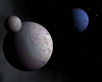 Santa Cruz CA (SPX) May 12, 2006 Triton may have abandoned an earlier partner to arrive in its unusual orbit around Neptune, researchers said Wednesday. Triton is unique among all large moons in the solar system because it follows a retrograde orbit around Neptune - opposite to the planet's rotation. Most astronomers think Triton is unlikely to have adopted its orbital path naturally and more likely was captured from elsewhere. Reporting in the May 11 issue of Nature, planetary scientists Craig Agnor of the University of California, Santa Cruz, and Douglas Hamilton of the University of Maryland in College Park said they have created a computer model that mimics the capture of moons involving a three-body gravitational encounter between a binary and a planet. The scenario, they said, could explain how Triton once was a member of a binary pair of objects orbiting the Sun and each other. Then, gravitational interactions during a close encounter with Neptune pulled Triton away from its companion and locked it in retrograde orbit around the gas giant. "We've found a likely solution to the long-standing problem of how Triton arrived in its peculiar orbit, Agnor said. "In addition, this mechanism introduces a new pathway for the capture of satellites by planets that may be relevant to other objects in the solar system." With properties similar to Pluto and about 40 percent more massive, Triton follows an inclined circular orbit that takes it between a group of small inner moons with conventional orbits and an outer group of small satellites with both prograde and retrograde orbits. The solar system has other retrograde moons, including some small outer satellites of Jupiter and Saturn, but all are tiny compared to Triton - less than a few thousandths of its mass - and follow much larger and more eccentric orbits. Agnor said Triton may have originated in a binary system similar to Pluto and Charon, which is relatively massive, at about one-eighth the size of Pluto. "It's not so much that Charon orbits Pluto, but rather both move around their mutual center of mass, which lies between the two objects," Agnor said. In a close encounter with a giant planet such as Neptune, the planet's gravitational forces could have pulled apart the binaries. Their orbital motion usually causes one member to move more slowly than the other, and disruption of the binary leaves both members with residual motions that can result in a permanent change of orbital companions. This mechanism, known as an exchange reaction, could have delivered Triton to a variety of different orbits around Neptune, Agnor said. An earlier scenario proposed for Triton was it could have collided with another Neptunian satellite, but this mechanism required the object involved in the collision to be large enough to slow Triton down, yet small enough not to destroy it. Agnor said he considers the probability of such a collision extremely small. Another suggestion involves the effect of aerodynamic drag from a disk of gas around Neptune, which slowed Triton down enough for it to be captured. The problem is the scenario constrains the timing of the capture event. It would have had to occur early in Neptune's history when the planet was surrounded by a gas disk, but late enough for the gas to disperse before it slowed Triton's orbit enough to send the moon crashing into the planet. In the past decade, many binaries have been discovered in the Kuiper belt and elsewhere in the solar system. Recent surveys indicate about 11 percent of Kuiper belt objects are binaries, as are about 16 percent of near-Earth asteroids. "These discoveries pointed the way to our new explanation of Triton's capture," Hamilton said. "Binaries appear to be a ubiquitous feature of small-body populations." The Pluto-Charon pair and binaries in the Kuiper belt are especially relevant for Triton, as their orbits abut Neptune's, he said. "Similar objects have probably been around for billions of years, and their prevalence indicates that the binary-planet encounter that we propose for Triton's capture is not particularly restrictive," Hamilton added. The scenario described by Agnor and Hamilton might have broad applications in understanding the evolution of the solar system, which contains many irregular satellites. The scientists said they plan to explore the implications of their findings for other satellite systems. Their research was supported by grants from NASA's Planetary Geology and Geophysics, Outer Planet Research, and Origins of Solar Systems programs. Community Email This Article Comment On This Article Related Links - The million outer planets of a star called Sol