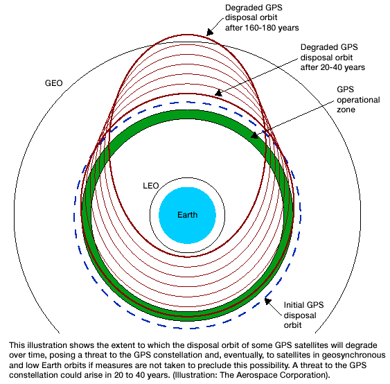 San Diego - March 7, 2002 By following revised procedures in disposing of decommissioned GPS satellites the possibility of collisions between these and operating satellites can be greatly reduced, researchers at The Aerospace Corporation have concluded. In studies for the Air Force, researcher Dr. Chia-Chun (George) Chao discovered that GPS satellites placed in disposal orbits can eventually, perhaps in 20 to 40 years, encroach into the operating constellation. This is because the disposal orbits, while circular initially, degenerate into orbits with significant eccentricity, or ovularity, mostly as the result of sun-moon gravitational perturbations. Besides intersecting the GPS constellation, these satellites eventually could pose a threat to operational satellites in low Earth and geosynchronous orbits, Dr. Chao said. The GPS constellation, comprising 28 satellites, operates at medium Earth orbit, about 11,000 miles above Earth. The solution, Aerospace studies show, is to