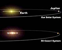 Pasadena - June 13, 2002 After 15 years of observation and a lot of patience, the world's premier planet-hunting team has finally found a planetary system that reminds them of our own home solar system. Dr. Geoffrey Marcy, astronomy professor at the University of California, Berkeley, and astronomer Dr. Paul Butler of the Carnegie Institution of Washington, Washington, D.C., today announced the discovery of a Jupiter-like planet orbiting a Sun- like star at nearly the same distance as the Jovian system orbits our Sun. "All other extrasolar planets discovered up to now orbit closer to the parent star, and most of them have had elongated, eccentric orbits. This new planet orbits as far from its star as our own Jupiter orbits the Sun," said Marcy. NASA and the National Science Foundation fund the planet-hunting team. The star, 55 Cancri in the constellation Cancer, was already known to have one planet, announced by Butler and Marcy in 1996. That planet is a gas giant slightly smaller than the mass of Jupiter and whips around the star in 14.6 days at a distance only one-tenth that from Earth to the Sun. Using as a yardstick the 93-million mile Earth-Sun distance, called an astronomical unit or AU, the newfound planet orbits at 5.5 AU, comparable to Jupiter's distance from our Sun of 5.2 AU (about 824 million kilometers or 512 million miles). Its slightly elongated orbit takes it around the star in about 13 years, comparable to Jupiter's orbital period of 11.86 years. It is 3.5 to 5 times the mass of Jupiter. "We haven't yet found an exact solar system analog, which would have a circular orbit and a mass closer to that of Jupiter. But this shows we are getting close, we are at the point of finding planets at distances greater than 4 AU from the host star," said Butler. "I think we will be finding more of them among the 1,200 stars we are now monitoring." The team shared its data with Dr. Greg Laughlin, assistant professor of astronomy and astrophysics at the University of California, Santa Cruz. His dynamical calculations show that an Earth-sized planet could survive in a stable orbit between the two gas giants. For the foreseeable future, existence of any such planet around 55 Cancri will remain speculative. "The existence of analogs to our solar system adds urgency to missions capable of detecting Earth-sized planets � first the Space Interferometry Mission and then the Terrestrial Planet Finder," said Dr. Charles Beichman, NASA's Origins Program chief scientist at the agency's Jet Propulsion Laboratory, Pasadena, Calif. "This planetary system will be the best candidate for direct pictures when the Terrestrial Planet Finder is launched later this decade," said UC Berkeley astronomer Dr. Debra A. Fischer. Marcy, Butler, Fischer and their team also announced a total of 13 new planets today, including the smallest ever detected: a planet circling the star HD49674 in the constellation Auriga at a distance of .05 AU, one-twentieth the distance from Earth to the Sun. Its mass is about 15 percent that of Jupiter and 40 times that of Earth. This brings the number of known planets outside our solar system to more than 90. Discovery of a second planet orbiting 55 Cancri culminates 15 years of observations with the 3-meter (118-inch) telescope at Lick Observatory, owned and operated by the University of California. The team also includes Dr. Steve Vogt, University of California, Santa Cruz; Dr. Greg Henry, Tennessee State University, Nashville; and Dr. Dimitri Pourbaix, the Institut d'Astronomie et d'Astrophysique, Universit� Libre de Bruxelles. The star 55 Cancri is 41 light years from Earth and is about 5-billion years old. Further data are needed to determine whether yet another planet is orbiting it, because the two known planets do not explain all the observed Doppler wobbling. One possible explanation is a Saturn-mass planet orbiting about .24 AU from the star. Community Email This Article Comment On This Article Related Links ExoPlanets Terrestrial Planet Finder SpaceDaily Search SpaceDaily Subscribe To SpaceDaily Express Life Beyond Earth Lands Beyond Beyond - extra solar planets - news and science