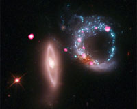 Giant Ring Of Black HolesHuntsville AL (SPX) Feb 11, 2011 Just in time for Valentine's Day comes a new image of a ring - not of jewels, but of black holes. This composite image of Arp 147, a pair of interacting galaxies located about 430 million light-years from Earth, shows X-rays from the NASA's Chandra X-ray Observatory (pink) and optical data from the Hubble Space Telescope (red, green, blue) produced by the Space Telescope Science Institute (STScI ... read more |