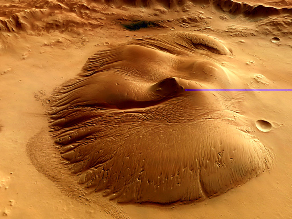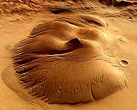 Paris, France (ESA) Jul 18, 2005 These images, taken by the High Resolution Stereo Camera (HRSC) on board ESA's Mars Express spacecraft, show Nicholson Crater, located at the southern edge of Amazonis Planitia on Mars. The HRSC obtained these images during orbit 1104 with a ground resolution of approximately 15.3 metres per pixel. The scenes show the region around Nicholson Crater, at approximately 0.0� South and 195.5� East. Nicholson Crater, measuring approximately 100 kilometres wide, is located at the southern edge of Amazonis Planitia, north-west of a region called Medusae Fossae. Located in the centre of this crater is a raised feature, about 55 kilometres long and 37 kilometres wide, which extends to a maximum height of roughly 3.5 kilometres above the floor of the crater. At present, it is still unclear how this central feature was shaped and what kind of processes led to its formation. It is thought that the remnant hill could be composed of material from underground or was built as a result of atmospheric deposition. The tall feature in the centre of this hill is the central peak of the crater, which forms when the surface material 'rebounds' after being compressed during the formation of an impact crater. However, it is clear that this feature has been heavily sculpted after its creation, by the action of wind or even water. The colour images were processed using the HRSC nadir (vertical view) and three colour channels. The perspective views were calculated from the digital terrain model derived from the stereo channels. The 3D anaglyph images were created from the nadir channel and one of the stereo channels. Stereoscopic glasses are needed to view the 3D images Image resolution has been decreased for use on the internet. For more information on Mars Express HRSC images, you might like to read our updated 'Frequently Asked Questions'. Community Email This Article Comment On This Article Related Links SpaceDaily Search SpaceDaily Subscribe To SpaceDaily Express Mars News and Information at MarsDaily.com Lunar Dreams and more