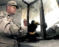 506th Air Expeditionary Group Public Affairs Kirkuk Air Base, Iraq (AFNS) Apr 04, 2007 The 506th Expeditionary Civil Engineer Squadron structures department team put their heads together to come up with a better way to protect the airmen who guard the base. By placing 3-inch thick, 260-pound safety glass with a titanium frame in the windows of the newly designed guard towers, the structures team is trying to ensure that those who are protecting the base are protected in return. "Because of the level of importance and the high degree of difficulty, the tower window project is one of our most rewarding tasks," said Senior Master Sgt. Clarence Super, the 506th structures superintendent. After ballistic windshields have been slightly penetrated during combat operations outside the wire, they are considered unserviceable for street patrols in Iraq. Although the windshields are not serviceable for convoy standards, the structures team found them to be a serviceable means of protection for servicemembers currently protected by plexiglass. Not only is the structures team potentially saving lives, they are also saving the military around $37,500 by recycling the windshields, Super said. Staff Sgt. Alan Baker, a civil engineer structures technician, designed a way to combine two damaged ballistic Humvee windshields so they would be sturdy enough to be mounted in the window openings of the new towers. The new towers are concrete structures designed to withstand blasts from possible mortar attacks as well as rocket and small-arms fire. Arch welders then welded together the windshields and custom-fabricated a frame with plates and brackets to bolt to the tower. Once the windshields were hoisted and properly placed in each of the new towers, structures technician Staff Sgt. Phillip Lavor came up with a way to seal off the openings on the sides of the windshields. Plexiglas was used on each side to enclose the openings and wood gave the windows more support. Having to fasten four separate types of material together (wood, metal, concrete and Plexiglas) was a complicated procedure. The plexiglas had to be affixed with hinges to maintain climate control when closed while allowing tower personnel to open and fire through it as necessary. "The ECES team is doing a great job," said Maj. Tamara Mayer, 506th ESFS commander. She said the windshield provides an increased amount of protection and also recycles something that would have been tossed. Community Email This Article Comment On This Article Related Links The latest in Military Technology for the 21st century at SpaceWar.com The latest in Military Technology for the 21st century at SpaceWar.com