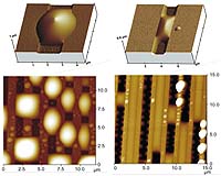 Garching, Germany (SPX) Feb 16, 2005 The labs of the future will be "labs-on-a-chip", i.e., integrated chemical and biochemical laboratories shrunk down to the size of a computer chip. An essential prerequisite for such labs are appropriate microcompartments for the confinement of very small amounts of liquids and chemical reagents. Directly accessible surface channels, which can be fabricated by available photolithographic methods, represent an appealing design principle for such microcompartments and, thus, provide a new route towards open microfluidic and nanofluidic systems. Scientists from the Max Planck Institute of Colloids and Interfaces, the Max Planck Institute of Dynamics and Selforganization and the University of California in Santa Barbara have shown that such open systems are possible in general but only if the geometry of the surface channels is carefully matched with their wettability (PNAS 102, 1848-1852 (2005). Many research groups around the world work towards the construction of "labs-on-a-chip" in order to integrate chemical and biochemical analyzers on the micrometer or even nanometer scale. These devices will significantly change the way in which research is performed in the life sciences since they offer the ability to work with much smaller reagent volumes, much shorter reaction times, and the possibility of massive parallel processing. In general, this should lead to increased throughput and, thus, to reduced cost of (bio)chemical analysis. In addition, such integrated labs-on-a-chip have many potential applications in biomedicine and bioengineering. In the context of biomedicine, for example, they could provide fast and detailed analysis of blood samples in the physician's office without the need to wait several days before the sample has been returned from specialized laboratories. Other applications include customized chips for space travel in order to monitor microbes inside spacecraft or to detect life on other planets. An obvious prerequisite for such miniaturized labs are appropriate microcompartments for the confinement of very small amounts of liquids and chemical reagents. Like the test-tubes in macroscopic laboratories, these microcompartments should have some basic properties: They should have a well-defined geometry by which one can measure the precise amount of liquid contained in them; they should be able to confine variable amounts of liquid; and they should be accessible in such a way that one can add and extract liquid in a convenient manner. An appealing design principle for such microcompartments is based on open and, thus, directly accessible surface channels which can be fabricated on solid substrates using available photolithographic methods. The simplest channel geometry which can be produced in this way corresponds to channels with a rectangular cross section. The width and depth of these channels can be varied between a hundred nanometer and a couple of micrometer. At first sight, it seems rather obvious to use such surface channels as microcompartments. However, if one actually tries to fill these channels with a certain liquid, one observes that the liquid often refuses to enter the channels. In fact, as shown in the new PNAS study, liquids at surface channels can attain a large variety of different wetting morphologies including localized droplets, extended filaments, and thin wedges at the lower channel corners. Examples for these morphologies as observed by atomic (or scanning) force microscopy (AFM) are shown in Figure 1. When the AFM experiments were first performed, it was not known how to produce a certain liquid morphology since there was no systematic theory for the dependence of this morphology on the materials properties and on the channel design. Such a theory has now been developed. This theory addresses the strong capillary forces between substrate material and liquid and takes the 'freedom' of contact angles at pinned contact lines into account. Such a contact line is visible in the upper right image in Figure 1. In such a situation, the contact angle is not determined by the classical Young equation but can vary over a wide range of values. A surprising prediction of the new theory is that the experimentally observed polymorphism of the wetting liquid depends only on two parameters: (i) the channel geometry, i.e., the ratio of the channel depth to the channel width; and (ii) the interaction between substrate material and liquid. One has to distinguish seven different liquid morphologies which involve localized droplets (D), extended filaments (F), and thin wedges (W) at the channel corners. For microfluidics applications, the most important morphology regime is (F) which corresponds to stable filaments. Since this regime covers a relatively small region of the morphology diagram, it can only be obtained if one carefully matches the channel geometry with the substrate wettability. Thus, a water filament in a narrow channel that has a width of 100 nanometer can sustain an overpressure up to 15 atm. In contrast, if the channel had a width of one millimeter, the water filament could only sustain a thousandth part of an atmosphere. One relatively simple application of the morphology is obtained if the system is designed in such a way that one can vary or switch the contact angle in a controlled fashion. One such method is provided by electrowetting; alternative methods, which have recently been developed, are substrate surfaces covered by molecular monolayers that can be switched by light, temperature, or electric potential. The experiments described in the PNAS study use a polymeric liquid that freezes quickly and can then be scanned directly with the tip of an atomic force microsope. However, the same morphology diagram should also apply to other liquids and other substrate materials. It should also remain valid if one further shrinks the surface channels and, in this way, moves deeper into the nanoregime. As one reaches 