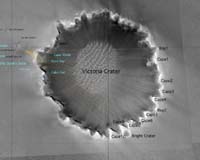 Pasadena CA (JPL) Dec 11, 2006 Opportunity is healthy and wrapping up imaging of "Bottomless Bay" (Bahia sin Fondo) at "Victoria Crater." On Sol 1016, Opportunity arrived at Bottomless Bay and began making science observations. Opportunity also performed step one of a series of checkouts of its new capability for more autonomous assessment of where it is safe to place its robotic arm. This test did not involve any arm motion. On Sol 1018, the alpha particle X-ray spectrometer measured the atmosphere's argon density. While pointed at the atmosphere, the instrument was turned on and left integrating for almost three hours. With the temperature and argon density in hand, scientists can calculate what percentage of the atmosphere at the rover site is argon. By doing measurements of this nature, scientists can get a better understanding of how atmospheric gases mix between the poles and the equator. On Sols 1019, 1020 and 1021 Opportunity was busy completing photography of Bottomless Bay. Sol-by-sol summaries Daily, Opportunity completes science observations that include: tau (atmospheric clarity) measurements with the panoramic camera, cloud searches with the navigation camera, and stares at the sky and ground with the miniature thermal emission spectrometer. Sol 1016 (Dec. 2, 2006): Opportunity drove for two hours, adding 30 meters (98 feet) onto its drive toward Bottomless Bay. The rover then took a navigation camera mosaic in the drive direction and completed step one of checking the capability for autonomous placement of the robotic arm. Sol 1017: Opportunity used part of this sol to conduct the daily science observations and then used the rest of the sol to recharge. Sol 1018: The rover examined the ground in front of it with the panoramic camera and the miniature thermal emission spectrometer. Those instruments were also used to monitor dust accumulation on the solar panels. The alpha particle X-ray spectrometer began a 2.5-hour argon density measurement. Sol 1019: The panoramic camera took images for the first half of a stereo mosaic of Bottomless Bay. Opportunity then turned so it would be in a better position for communication. Sol 1020: Opportunity used part of this sol to conduct the daily science observations and then used the rest of the sol to recharge. Sol 1021 (Dec. 7, 2006): The rover took a 2-meter (6.6 feet) drive along Bottomless Bay and the panoramic camera took the second half of the stereo mosaic of Bottomless Bay. As of sol 1016's drive, Opportunity's total odometry is 9,584.69 meters (6 miles)! Community Email This Article Comment On This Article Related Links Mars Rovers at JPL Mars Rovers at Cornell Mars News and Information at MarsDaily.com Mars News and Information at MarsDaily.com Lunar Dreams and more