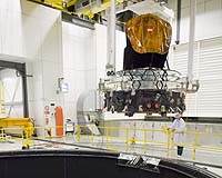 Noordwijk, Netherlands (ESA) Apr 15, 2008 On Wednesday the 2nd of April the Planck flight model spacecraft was placed inside the Large Space Simulator (LSS) at the ESTEC test facilities for fine balancing. After the arrival on 28 March at ESTEC, unpacking, and several spacecraft preparations in the cleanroom, the Planck spacecraft was hoisted up from its ground support equipment (GSE) and transferred to the LSS by means of the overhead crane. After its placement inside the LSS, removal of the telescope's protective cover and inspections of the spacecraft and setup, a dry run was performed on Thursday morning, 3 April. The dry run was performed in ambient conditions with the door of the LSS still open, to verify the stability of the configuration before the actual fine balancing activities. Later that day the LSS was closed and the proper test runs started. Over the following days the Planck spacecraft was repeatedly spun inside the LSS in light-vacuum conditions (1 mbar) at 30 rpm. Four sets of ten test runs were performed between 3 and 9 April, using masses attached to the spacecraft's service module for fine balancing. As Planck is a spin-stabilized spacecraft that will rotate in space at 1 rpm, the fine balancing of the spacecraft is required to ensure that the spacecraft spins around its nominal spin axis, with a minimal wobble that falls within specifications. The first set of ten test runs (spinning both clockwise and counter clockwise to eliminate any systematic errors) was performed with no masses attached to obtain a reference in vacuum of the spacecraft wobble, which was compared with the values expected from a detailed model. In the following sets of measurements 4.5 kg was attached to the service module and the spacecraft was spun again at 30 rpm, with different orientations between the spacecraft and the mounting to eliminate uncertainties in the contribution from the mounting. On Wednesday, 9 April, the last spin test was completed and later that day the LSS was repressurized. With the successful completion of the fine balancing in light-vacuum conditions, the spacecraft is being hoisted out of the LSS today, Friday 11 April. At the end of next week the Planck spacecraft will be prepared for transport from the ESTEC test facilities in Noordwijk to the Centre Spatial de Li�ge (CSL). Community Email This Article Comment On This Article Related Links Space Telescope News and Technology at Skynightly.com