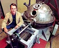 Madison - October 20, 1999 - For more than 100 years, scientists have been trying to tease out the secrets of the natural, magnetic field-generating dynamos that exist in the Earth and virtually all other celestial objects from stars to galaxies.But the phenomenon, which occurs deep within the Earth at its outer core of molten iron, or at vast distances from our planet, has proved inaccessible, a mystery shielded by miles of rock or distances often measured in light years. Caption: Physics professor Cary Forest shows off a large stainless steel sphere used for the Madison Dynamo Experiment, which is expected to demonstrate how molten iron combines with the planet's rotational energy to generate the self-perpetuating magnetic field responsible for effects that range from spinning compass needles to shielding our planet from dangerous cosmic rays. Photo by Jeff Miller Now, however, scientists may soon get the opportunity to study the phenomenon firsthand. The finishing touches are being applied to a university experiment that will attempt to recreate -- in a 1-meter-wide stainless steel sphere -- the same conditions that give rise to the self-perpetuating magnetic fields seen in nature. "This is something that hasn't been done before," says Cary Forest, a physics assistant professor. Forest leads one of several groups from around the world racing to be the first to mimic a well-known, but poorly understood, feature seen in the Earth and other rotating objects such as stars, galaxies and planets. "You can't measure it in the Earth. You can only look at it from far away," says Forest. At the heart of the Madison Dynamo Experiment is perhaps the world's most unusual blender, a large stainless steel sphere fitted with two opposing propellers.
