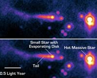 Tucson AZ (SPX) Oct 04, 2006 A star must live in a relatively tranquil cosmic neighborhood to foster planet formation, say astronomers using NASA's Spitzer Space Telescope. A team of scientists from the University of Arizona's Steward Observatory, Tucson, came to this conclusion after watching intense ultraviolet light and powerful winds from O-type stars rip away the potential planet-forming disks, or protoplanetary disks, around stars like our sun. At up to 100 times the mass of the sun, O stars are the most massive and energetic stars in the universe. They are at least a million times more powerful than the sun. According to Zoltan Balog, lead author of the team's paper, the super-sensitive infrared eyes of Spitzer are ideal for capturing the "photoevaporation" of these planet-forming disks. In this process, immense output from the O star heats the disks that are surrounding nearby sun-like stars so much that gas and dust boil off (much like the evaporation of boiling water), and the disk can no longer hold together. Photon (or light) blasts from the O star then blow away the evaporated material, potentially stripping the sun-like stars of their ability to form planets. "We can see that these systems take on a cometary structure as they are being blown away and destroyed," Balog said. "No other telescope has ever captured the photoevaporation of a protoplanetary disk in this much detail," added Kate Su, who is a co-author on Balog's paper. The photoevaporation process is very similar to the one that forms the tail of a comet as it swings by the inner solar system, only a lot more violent and on a far larger scale, Su said. "Every time a particle of light from the O star hits a dust grain in the nearby protoplanetary disk, the light particle pushes the dust grain away from its host star," Su said. "This is very similar to how comet tails form." "Unfortunately these sun-like stars just got a little too close to the fire," George Rieke said. Rieke is also a co-author on the paper and the principal investigator for Spitzer's Multiband Imaging Photometer (MIPS) instrument, which made the new observations. Ultimately, the astronomers hope to determine whether all stars have planets, and if not, how a star loses the ability to form them. The Spitzer findings will help astronomers understand what regulates the process of planet formation. Team members say that originally they were looking for "diskless stars" in their survey, stars that had ventured too close to an O star and no longer had any disk left. With so many O stars in the region, they didn't expect that a protoplanetary disk would survive for very long. However, they found something different - stars that had recently blundered into the hostile neighborhood of an O star and were still in the process of losing their disks. "To see protoplanetary disks in an area where no one expected to see one is very exciting," Balog said. "But to see a disk in the process of evaporating is even more thrilling." Balog's paper was recently accepted for publication in Astrophysical Journal. He is currently is at the University of Arizona on leave from the Department of Optics and Quantum Electronics, University of Szeged, Hungary. UA astronomers James Muzerolle and Erick T. Young collaborated with Balog, Rieke and Su in the observations. Community Email This Article Comment On This Article Related Links Beyond Sol Lands Beyond Beyond - extra solar planets - news and science Life Beyond Earth