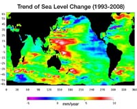 Pasadena CA (SPX) Aug 15, 2008 Warming water and melting land ice have raised global mean sea level 4.5 centimeters (1.7 inches) from 1993 to 2008. But the rise is by no means uniform. This image, created with sea surface height data from the Topex/Poseidon and Jason-1 satellites, shows exactly where sea level has changed during this time and how quickly these changes have occurred. It's also a road map showing where the ocean currently stores the growing amount of heat it is absorbing from Earth's atmosphere and the heat it receives directly from the Sun. The warmer the water, the higher the sea surface rises. The location of heat in the ocean and its movement around the globe play a pivotal role in Earth's climate. Light blue indicates areas in which sea level has remained relatively constant since 1993. White, red, and yellow are regions where sea levels have risen the most rapidly-up to 10 millimeters per year-and which contain the most heat. Green areas have also risen, but more moderately. Purple and dark blue show where sea levels have dropped, due to cooler water. The dramatic variation in sea surface heights and heat content across the ocean are due to winds, currents and long-term changes in patterns of circulation. From 1993 to 2008, the largest area of rapidly rising sea levels and the greatest concentration of heat has been in the Pacific, which now shows the characteristics of the Pacific Decadal Oscillation (PDO), a feature that can last 10 to 20 years or even longer. In this "cool" phase, the PDO appears as a horseshoe-shaped pattern of warm water in the Western Pacific reaching from the far north to the Southern Ocean enclosing a large wedge of cool water with low sea surface heights in the eastern Pacific. This ocean/climate phenomenon may be caused by wind-driven Rossby waves. Thousands of kilometers long, these waves move from east to west on either side of the equator changing the distribution of water mass and heat. This image of sea level trend also reveals a significant area of rising sea levels in the North Atlantic where sea levels are usually low. This large pool of rapidly rising warm water is evidence of a major change in ocean circulation. It signals a slow down in the sub-polar gyre, a counter-clockwise system of currents that loop between Ireland, Greenland and Newfoundland. Such a change could have an impact on climate since the sub-polar gyre may be connected in some way to the nearby global thermohaline circulation, commonly known as the global conveyor belt. This is the slow-moving circulation in which water sinks in the North Atlantic at different locations around the sub-polar gyre, spreads south, travels around the globe, and slowly up-wells to the surface before returning around the southern tip of Africa. Then it winds its way through the surface currents in the Atlantic and eventually comes back to the North Atlantic. It is unclear if the weakening of the North Atlantic sub-polar gyre is part of a natural cycle or related to global warming. This image was made possible by the detailed record of sea surface height measurements begun by Topex/Poseidon and continued by Jason-1. The recently launched Ocean Surface Topography Mission on the Jason-2 satellite (OSTM/Jason-2) will soon take over this responsibility from Jason-1. The older satellite will move alongside OSTM/Jason-2 and continue to measure sea surface height on an adjacent ground track for as long as it is in good health. Topex/Poseidon and Jason-1 are joint missions of NASA and the French space agency, CNES. OSTM/Jason-2 is collaboration between NASA; the National Oceanic and Atmospheric Administration; CNES; and the European Organisation for the Exploitation of Meteorological Satellites. JPL manages the U.S. portion of the missions for NASA's Science Mission Directorate, Washington, D.C. Community Email This Article Comment On This Article Share This Article With Planet Earth