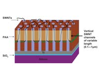 West Lafayette IN (SPX) Aug 04, 2006 Engineers at Purdue University have developed a technique to grow individual carbon nanotubes vertically on top of a silicon wafer, a step toward making advanced electronics, wireless devices and sensors using nanotubes by stacking circuits and components in layers. The technique might help develop a method for creating "vertically oriented" nanoelectronic devices, the electronic equivalent of a skyscraper, said Timothy S. Fisher, an associate professor of mechanical engineering who is leading the work with Timothy D. Sands, the Basil S. Turner Professor of Engineering. "Verticality gives you the ability to fit more things into the same area, so you can add more and more layers while keeping the footprint the same size or smaller," Fisher said. "But before we can even think about using nanotubes in electronics, we have to learn how to put them where we want them." The engineers first created a "thin film" containing two layers of aluminum sandwiching one ultra-thin layer of iron using electron-beam evaporation, a standard process employed in the semiconductor industry. The engineers then used "anodization," a process that causes metals to oxidize - like rusting - to selectively create tiny cylindrical cavities and turn the film into a "porous anodic alumina template" less than 1/100th the width of a human hair in thickness. During the process, an electric field was used to form a precisely aligned array of nanoscopic holes, turning aluminum into porous alumina, the oxidized form of aluminum also known as aluminum oxide. A mixture of hydrogen and methane gas was then flowed into the template's holes, and microwave energy was applied to break down the methane, which contains carbon. The iron layer acted as a catalyst that prompted the carbon nanotubes to assemble from carbon originating in the methane, and the tubes then grew vertically out of the cavities. "You get a single nanotube in each pore, and that's important because we can start to think about controlling how and where to put nanotubes to vertically integrate them for future electronic devices and sensing technologies," Sands said. Findings are detailed in a research paper that appeared July 11 in the journal Nanotechnology. The paper was written by graduate students Matthew R. Maschmann and Aaron D. Franklin; postdoctoral research associate Placidus Amama; Dmitri Zakharov, a staff scientist at Purdue's Birck Nanotechnology Center; Eric Stach, an associate professor of materials engineering; Sands and Fisher. "The pores in the template and the nanotubes that grow in the pores really self-assemble once you set the process in motion," said Stach, who used two types of electron microscopes to take images of the nanotubes emerging vertically from the cavities. The research is based at the Birck Nanotechnology Center in Purdue's Discovery Park, the university's hub for interdisciplinary research. The cavities form within seconds, and the nanotubes take several minutes to finish growing. The holes vary in width from 30-50 nanometers. A nanometer, or billionth of a meter, is about as long as 10 atoms strung together. Carbon nanotubes, which were discovered in the early 1990s, might enable industry to create new types of transistors and more powerful, energy-efficient computers, as well as ultra-thin "nanowires" for electronic circuits. Reaching that potential promise, however, won't be possible unless carbon nanotubes can be integrated with other parts of circuitry and devices, Sands said. The experiments at Purdue yielded both single- and double-walled nanotubes, meaning they are made of either one or two single sheets of carbon atoms, yielding tubes about one nanometer in diameter. Researchers will continue the work in efforts to understand which conditions are needed to produce single-wall tubes versus the double-wall variety and to learn how to produce more of one or the other. Other researchers previously have made the templates, but the Purdue researchers are the first to add a layer of iron, which was Maschmann's idea, Fisher said. "He was told by many people, including me, that it probably wouldn't work," Fisher said. "We were surprised to see that the nanotubes grow from the sidewall of the hole and then extend vertically." Early applications are most likely in wireless computer networks and radar technology. Long-term uses are possible in new types of transistors, other electronic devices and circuits. The research is funded by NASA, through the Purdue-based Institute for Nanoelectronics and Computing. Community Email This Article Comment On This Article Related Links Timothy Fisher Timothy Sands Birck Nanotechnology Center Discovery Park Nano Technology News From SpaceMart.com Computer Chip Architecture, Technology and Manufacture