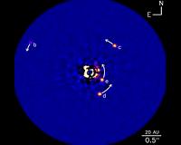 Planetary Family Portrait Reveals Another ExoplanetVictoria, Canada (SPX) Dec 15, 2010 An international team of astronomers has discovered a fourth giant planet, HR 8799e, outside our solar system. The new planet joins the three planets that were the subjects of the first-ever images of a planetary family orbiting a star other than our Sun. The planets orbit the star HR 8799, which lies about 129 light years from Earth and is faintly visible to the naked eye. All four planet ... read more |