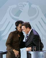 Berlin (AFP) Feb 04, 2005 US Secretary of State Condoleezza Rice, seeking to allay European fears of a preemptive US strike on Iran's nuclear sites, said Friday an attack "is simply not on the agenda at this point". Rice made her remarks in London at the start of a tour of Europe where concern has been expressed that the hardening US rhetoric against Iran could herald military action to knock out its nuclear capabilities. "The question is simply not on the agenda at this point," Rice told a news conference after talks with British Prime Minister Tony Blair and Foreign Secretary Jack Straw. "We have diplomatic means to do this," she said, citing the possibility of action by the UN Security Council among them. "We have many diplomatic tools still at our disposal and we intend to pursue them fully." Britain, Germany and France are engaged in halting efforts to persuade Iran to renounce any nuclear weapons ambitions and have eschewed the use of force against the Islamic Republic. German Chancellor Gerhard Schroeder had what he called "extensive discussions" with Rice on Iran and said later the Europeans would do "everything and anything to come to a diplomatic and political solution." Some Europeans have voiced complaints the United States was keeping its distance from the negotiations but Straw insisted the world community was united in its determination to rein in Iran's nuclear activities. "Absolutely fundamental to the international consensus has been the support we have received in the IAEA (the UN's Vienna-based International Atomic Energy Agency) board and in many other ways from the United States, he said. "It's been a joint diplomatic effort, albeit three countries are directly involved in the negotiations." Washington has ratcheted up its rhetoric against Iran in recent days, with Rice using unusually strong language Thursday to rap Tehran's human rights record as "something to be loathed". Although Rice has side-stepped questions whether the United States supported outright regime change in Tehran, a senior State Department official signaled a more aggressive US tone in support of pro-democracy elements in Iran. "The president and the secretary have made it more explicit that we support the aspirations of the Iranian people to control their own government," said the official, who asked to he said. Straw and Schroeder had little trouble with the tough US comments and rejected any suggestion that they could compromise efforts to negotiate with Tehran. "I would be astonished if Secretary Rice had not had strong feelings about the human rights record of the Iranian regime because that is shared by us," Britain's top diplomat said. He said that, while there had been some improvements in Tehran under Iranian reformers, "that has now gone backwards and therefore is a matter of profound concern." Schroeder told a joint news conference with Rice in Berlin that US President George W. Bush's "heart is where it should be" on democracy in Iran and "I couldn't agree more." "I don't believe at all that there will be any weakening effect on the ongoing EU three negotiations," he said. The question of Iran has so far overshadowed the announced purposes of Rice's tour to prepare for Bush's own fence-mending trip to Europe later this month and promote US policies in Iraq and the Middle East. But Schroeder, who staunchly opposed the Iraq war, offered more help from Germany in the rebuilding of Iraq's institutions and the training of security forces following landmark elections there last weekend. "I have declared Germany's readiness to not just continue these projects but, if desired, to also expand on them," Schroeder told reporters. On another subject, Straw sought to mollify the United States over EU plans to lift a 15-year-old arms embargo on China. The minister pledged to consider Washington's "justifiable anxieties" over the move. Straw also appeared to seek accommodation on where to try suspected war criminals in Sudan's western region of Darfur, where some 70,000 people have died in fighting pitting rebels against Khartoum and its militia allies. The United Nations has suggested using the International Criminal Court based in The Hague but Washington is pressing to create a special UN tribunal in Arusha, Tanzania. "All of us know that the natural authority of the international community is greatly strengthened where there is a consensus behind a Security Council decision, and that's what we shall be working to achieve," Straw said. Rice was to leave Saturday for Poland on the third leg of her trip, which will also take her to Turkey, Israel, the West Bank, Italy, France, Belgium and Luxembourg. Community Email This Article Comment On This Article Related Links SpaceDaily Search SpaceDaily Subscribe To SpaceDaily Express Learn about nuclear weapons doctrine and defense at SpaceWar.com Learn about missile defense at SpaceWar.com All about missiles at SpaceWar.com Learn about the Superpowers of the 21st Century at SpaceWar.com