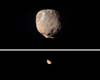 Laurel MD (SPX) Nov 28, 2007These two images taken by the Compact Reconnaissance Imaging Spectrometer for Mars (CRISM) show Mars' two small moons, Phobos and Deimos, as seen from the Mars Reconnaissance Orbiter's low orbit around Mars. Both images were taken while the spacecraft was over Mars' night side, with the spacecraft turned off its normal nadir-viewing geometry to glimpse the moons. The image of Phobos, shown at the top, was taken at 0119 UTC on October 23 (9:19 p.m. EDT on Oct. 22), and shows features as small as 400 meters (1,320 feet) across. |