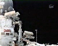 Moscow (RIA Novosti) Jul 17, 2008 Two Russian astronauts on the International Space Station successfully completed a six-hour spacewalk, Russia's mission control said on Wednesday. This was the second spacewalk in a week for commander Sergei Volkov and flight engineer Oleg Kononenko, who successfully fitted a docking target to the Zvezda module to allow a Russian research lab, scheduled for delivery next year, to be attached to the ISS. The crew attached an apparatus to the Zvezda module for a new geophysical experiment designed to predict earthquakes and retrieved hardware used in previous scientific tests. On July 11 Volkov and Kononenko, part of the 17th Expedition, made a daring exit to repair the Soyuz descent capsule, the pair removed an explosive bolt, thought to be responsible for recent reentry problems and bumpy landings on flights back to Earth. The third crew member, U.S. astronaut Greg Chamitoff, once again had to spend the entire six hours sealed in the Soyuz capsule. The ISS crew is scheduled to increase from three members to six in May 2009.