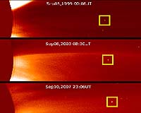 Greenbelt MD (SPX) Sep 28, 2007 The Solar and Heliospheric Observatory (SOHO) has discovered a rare periodic comet. SOHO has already discovered more than 1,350 comets during its mission, but this is the first time one of its discoveries officially has been designated periodic. Many of the comets SOHO has discovered are believed to be periodic, meaning they follow their orbits around the sun more than twice and have orbital periods of less than 200 years. Thousands of comets have been seen by astronomers, but only around 190 are classified as periodic. The most famous periodic comet is Halley's Comet, which returns every 76 years. It most recently passed close to the sun in 1986. SOHO's new find has a much smaller orbit than Halley's Comet. It takes the comet approximately four years to travel once around the sun. It was first seen in September 1999 and then again in September 2003. In 2005, German PhD student Sebastian Hoenig realized that the two comets were so similar in orbit that they might actually be the same object. To test his theory, he calculated a combined orbit for the comet and consequently predicted that it would return on Sept. 11, 2007. Hoenig's prediction proved to be extremely accurate -- the comet reappeared in SOHO's Large Angle and Spectrometric Coronagraph camera right on schedule and has now been given the official designation of P/2007 R5 (SOHO). Credit for the original discovery and recovery of the object goes to Terry Lovejoy (Australia, 1999), Kazimieras Cernis (Lithuania, 2003) and Bo Zhou (China, 2007). A puzzling aspect to P/2007 R5 (SOHO) is that it does not look exactly like a comet. It has no visible tail or coma of dust and gas, as is traditionally associated with the phenomena. Initially, this led some scientists to wonder if the object was actually an asteroid, a chunk of space-rock, rather than a chunk of space-ice. However, P/2007 R5 (SOHO) did exhibit some characteristics consistent with a comet. As scientists watched the object pass close to the sun, drawing to within 4.9 million miles, or around 5% of the distance between the Earth and the sun, they saw it brighten by a factor of around a million, which is common behavior for a comet. "It is quite possibly an extinct comet nucleus of some kind," says Karl Battams of the Naval Research Laboratory, Washington, who runs SOHO's comet discovery program. Extinct comets have expelled most of their volatile ices and retain little to form a tail or coma. They are theorized to be common objects among the celestial bodies orbiting close to the sun. This comet faded as quickly as it brightened, and soon became too faint for SOHO's instruments to see. Estimates show that P/2007 R5 (SOHO) is probably only 100 to 200 yards in diameter. Given how small and faint this object is, and how close it still is to the sun, it is an extremely difficult target for observers on Earth to pick out in the sky. Now we know for certain that P/2007 R5 (SOHO) is there, astronomers will be watching closely for it during its next return in September 2011. SOHO is a cooperative project between the European Space Agency and NASA. Community Email This Article Comment On This Article Related Links SOHO Mission Asteroid and Comet Mission News, Science and Technology