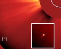 Paris - Apr 07, 2004 On 22 March 2004, the ESA/NASA SOHO solar observatory spacecraft discovered its 750th comet since its launch in December 1995. SOHO comet 750 was discovered by the German amateur astronomer Sebastian H�nig, one of the most successful SOHO comet-hunters. It was a part of the Kreutz family of 'sungrazing' comets, which usually evaporate in the hot solar atmosphere. The LASCO coronagraph on SOHO, designed for seeing outbursts from the Sun, uses a mask to block the bright rays from the visible surface. It monitors a large volume of surrounding space and, as a result, has become the most prolific 'discoverer' of comets in the history of astronomy. Its images are displayed on the internet. More than 75% of the discoveries have come from amateur comet hunters around the world, watching these freely available SOHO images on the internet. So, anyone with internet access can take part in the hunt for new comets and be a 'comet discoverer'! Click here for information about how to search for your own comet: http://ares.nrl.navy.mil/sungrazer/ SOHO is a mission of international co-operation between ESA and NASA, launched in December 1995. Every day SOHO sends thrilling images from which research scientists learn about the Sun's nature and behaviour. Experts around the world use SOHO images and data to help them predict 'space weather' events affecting our planet. Community Email This Article Comment On This Article Related Links SOHO SpaceDaily Search SpaceDaily Subscribe To SpaceDaily Express Asteroid and Comet Mission News, Science and Technology