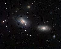 A Disturbed Galactic DuoParis, France (SPX) Apr 25, 2011 The galaxies in this cosmic pairing, captured by the Wide Field Imager on the MPG/ESO 2.2-metre telescope at the La Silla Observatory in Chile, display some curious features, demonstrating that each member of the duo is close enough to feel the distorting gravitational influence of the other. The gravitational tug of war has warped the spiral shape of one galaxy, NGC 3169, and fragmented t ... read more |