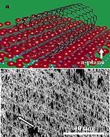 Los Angeles CA (SPX) Apr 26, 2005 On crystal surfaces, nanotubes self-guide themselves into dense structures with exciting potential applications as sensors or integrated circuits USC researchers have found that sapphire surfaces spontaneously arrange carbon nanotubes into useful patterns - but only the right surfaces. Nanotubes are one-atom thick sheets of carbon rolled into seamless cylinders. They can be used to work as chemical sensors and transistors, like devices made from carbon's close chemical cousin, silicon. As a substrate for the creation of single wall nanotube (SWNT) devices, sapphire has a critical advantage, says Chongwu Zhou of the USC Viterbi School of Engineering's department of electrical engineering. Single walled carbon nanotubes will grow along certain crystalline orientations on sapphire. No template has to be provided to guide this structuring: it takes place automatically. Or more accurately, it sometimes happens automatically. With an elegant experiment, Zhou has resolved how and why this occurs. The process is potentially predictable and controllable, opening the door for systematic exploration of sapphire as a SWNT (single wall nanotube) transistor medium. In a paper accepted by the Journal of the American Chemical Society (V127, P5294, 2005), Zhou says the understanding "may allow registration-free fabrication and integration of nanotube devices by simply patterning source/ drain electrodes at desired locations, as the active material (i.e., nanotubes) is all over the substrate," to build such devices as sensors and integrated circuits for various uses. According to Zhou, nanotube transistor devices now have to be painstakingly positioned and aligned using methods such as flow alignment and electrical-field-assisted alignment and then individually connected.