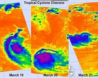 NASA IR Satellite Imagery Shows Cyclone Cherono DwindlingGreenbelt MD (SPX) Mar 23, 2011 Three days of NASA infrared satellite imagery provides a clear picture to forecasters of the effect wind shear has had on former Cyclone Cherono. Wind shear increased near Cyclone Cherono this weekend and weakened it down to a remnant low pressure area in the Southern Indian Ocean. Cherono's remnants have moved away from Mauritius and still causing ocean swells. NASA's Aqua satellite flew ... read more |