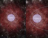 Greenbelt MD (SPX) Feb 12, 2007 Astronomers have found a new class of objects in space: a neutron star orbiting inside a cocoon of cold gas and/or dust that hides a bloated supergiant star. In a strange twist of fate, these objects may be tremendously luminous, but the enshrouding cocoon absorbs almost all their emission, making them nearly invisible to telescopes on Earth until now. These findings were presented on Feb. 5, 2007 by Dr. Sylvain Chaty of the University Paris 7 and Service d'Astrophysique, CEA, France, at the first Gamma Ray Large-Area Space Telescope (GLAST) scientific Symposium meeting in Palo Alto, Calif. This result, obtained through multi-wavelength observations, is of special interest because it revolutionizes the view scientists have on the formation, evolution, and fate of massive stars in close binary (twin star) systems. Furthermore, this clearly demonstrates that the GLAST satellite will likely discover more of these new and unexpected celestial objects. This new class of objects was discovered using the European "INTErnational Gamma-Ray Astrophysics Laboratory" (INTEGRAL) satellite. Twenty of these binary systems were found, with estimated distances lying between 7,000 and 25,000 light years from Earth, putting them all inside of our own Milky Way Galaxy. The nature of these sources was revealed through multi-wavelength observations, mainly from optical to mid-infrared (MIR) wavelengths, using European Southern Observatory (ESO) facilities. Scientists have found that most of these sources are made up of a compact object orbiting a supergiant star, an enormous star with 30 times the Sun's mass and 20 times its diameter. Stars like this eject a huge amount of cold gas and/or dust at a rate equivalent to emitting the mass of our Sun in just 100,000 years. This type of object is called a High Mass X-ray Binary System (HMXB) and in most cases the compact object is a neutron star, an object of about 1.4 solar masses concentrated in a radius of only 10 kilometers (6.2 miles). Normally, an object like this would be an intense source of X-rays as the tremendous gravity and magnetic fields of the neutron star interact with the dense gas and dust emitted from the more massive supergiant star. However, for this new class of objects the cocoon of cold gas and/or dust is so dense it absorbs most, but not quite all, of the high energy X-rays. Only multi-wavelength observations, from X-rays to infrared, were able to reveal the nature of such objects. These systems seem to divide into two classes, likely depending on the size and eccentricity (ellipticity) of the orbit of the neutron star around its companion. In the first class of objects, such as IGR J16318-4848, the neutron star orbits around the supergiant star along a roughly circular orbit, like the Earth does around the Sun. However, in this case, the orbit is far smaller: the distance from the neutron star to the supergiant is less than the distance of Mercury from the Sun-even though the supergiant star's radius is 20 times bigger than that of the Sun. Since the cocoon of cold gas/dust totally blankets the whole system, the neutron star stays permanently inside this dense cocoon, so there is a persistent source of X-rays. But in the second class, such as IGR J17544-2619, the orbit is more eccentric, and the neutron star crosses only periodically into this dense cocoon of cold gas/dust covering the supergiant star, causing intermittent emission of X-rays during that time. As Dr. Chaty, Associate Professor of Astrophysics at University Paris 7 and Service d'Astrophysique, CEA, France, points out, these findings are important because "...until now only a few high energy systems hosting supergiant stars were known, and none were exhibiting such a high absorption. We now have an example where we know the extent of the material causing this absorption, and also where it is coming from." "This finding will help us to understand the formation, evolution and fate of such massive stars in high energy binary systems. This result demonstrates that astronomers will likely discover previously unknown objects with the GLAST satellite, and that a multi-wavelength approach can be decisive to unveil their nature." Further work, both observational and theoretical, is therefore needed to study the environment of supergiant stars in binary star systems. GLAST, with its sensitivity to very high-energy gamma rays, will provide an ideal platform for follow-up observations. GLAST is slated for launch in the fall of 2007. It is a collaborative effort between NASA, the U.S. Department of Energy and institutions in France, Germany, Japan, Italy and Sweden. General Dynamics has been chosen to build the spacecraft. Community Email This Article Comment On This Article Related Links GLAST at Goddard GLAST 2007 Symposium Stellar Chemistry, The Universe And All Within It Stellar Chemistry, The Universe And All Within It