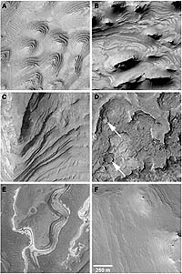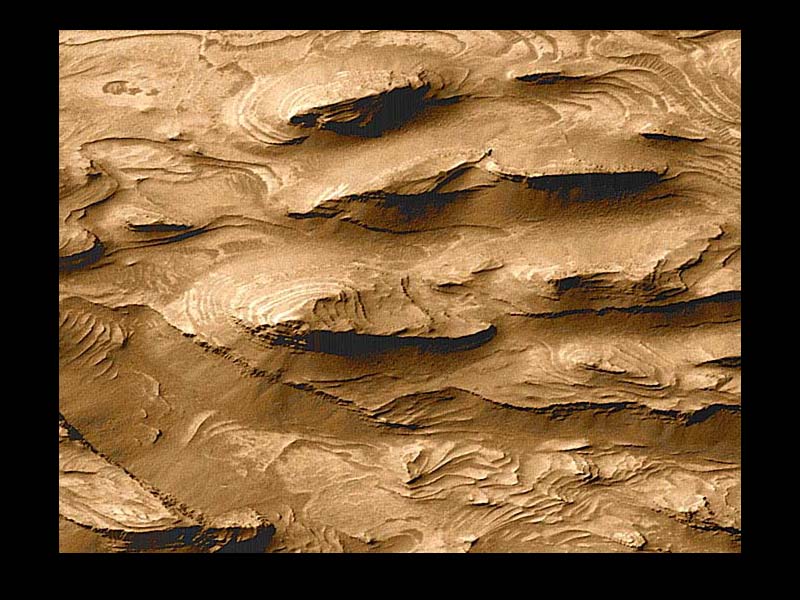 Washington - Dec. 4 2000 Layered geologic outcrops on Mars, that will be described in this week's issue of the journal Science -- may be composed of sedimentary rock that dates from the earliest span of martian history, between 4.3. and 3.5 billion years ago. Images of these sedimentary rock exposures, captured by the Mars Orbiter Camera (MOC), suggest that parts of ancient Mars may have resembled a land of lakes, and that the geology of early Mars was much more dynamic than previously suspected. If life existed on Mars during this time period, researchers believe that the fossil remnants of that past life may be sandwiched within the sedimentary rock layers, just as they are on Earth. The martian outcrops, in some cases a few kilometers thick, appear to be made of fine-grained materials deposited in horizontal layers, the hallmark of sedimentary rock. These outcrops are found inside craters, between craters, and within chasms, said Michael C. Malin and Kenneth S. Edgett of Malin Space Science Systems in San Diego, California. The Science researchers identified three main outcrop types from the MOC images: layered units, massive units, and thin mesa units. Layered units, as their name suggests, consist of relatively thin rock beds -- some only a few meters thick -- stacked on top of one another in distinct groups. Massive units appear as one bulky rock layer with no clearly defined horizontal bedding. In a few cases, these types appear together, with the massive unit always perched on top of the bedded unit like a thick, indistinct coat of frosting on a layer cake. Thin mesa units, with surfaces ranging from smooth to pitted to ridged and grooved, are almost always found on top of eroded massive or layered sedimentary rock. While sediments can be deposited in a variety of ways -- including wind, water, volcanic activity, and even cosmic impact -- the prevalence of the martian sedimentary outcrops within basin-like features suggests that they were deposited by water, perhaps in lakes that formed within the craters and chasms, said Malin and Edgett. Under this scenario, sediments may have been transported into the lakes in regular, swift pulses, building up thin layer units. Massive units may have been deposited when the lake became stagnant or deep enough to cause sediments to sift down through the water over longer intervals. "Some of the MOC images of these outcrops show hundreds and hundreds of identically thick layers, which is almost impossible to have without water," said Malin. The sedimentary units show no telltale signs of wind deposition, and the researchers concluded that explosive volcanic eruptions and impact cratering probably could not have produced enough sediment to create the large-scale and geographically widespread outcrops seen on the martian surface. Although Malin and Edgett favor water as the sedimentary suspect, they also offer an alternative model that involves changes in atmospheric pressure on early Mars. They suggest that periods of relatively high atmospheric pressure -- caused by fluctuations in the amount of solid carbon dioxide on the planet's surface -- could have increased the atmosphere's ability to carry dust produced by heavy cratering. To confuse matters, the Science researchers don't know where the original sediments came from, or how they were transported to their final resting places, since there are no traces of gullies or streams or other channels associated with the outcrops. They think that erosion may have wiped out both the source of the sediments and their travel routes. In some cases, sedimentary rock has eroded out of the crater in which it formed, also vanishing without a geologic clue. To Malin, the history of martian geology looks like a jigsaw puzzle. "In the center of the puzzle, we have these layered rocks, which are good evidence of an extremely dynamic environment. On either side of this well-developed puzzle piece, we have mysteries." In any case, Mars' sedimentary rocks suggest a very active early history for the planet. "This makes Mars more complicated and more exciting. This record is going to tell us a lot about what early Mars was like, and maybe the early Earth as well, since we don't have a lot of rocks on our own planet from this time period," said Edgett.