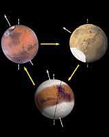 Paris, France (SPX) Oct 28, 2004 Since the arrival of Mars Global Surveyor and more recently Mars Odyssey spacecrafts, a range of facts has revealed the existence of frozen water ice in the top meters of high latitudes near-surface (~60 deg - 90 deg) of both martian hemispheres. However, its origin was still unexplained. Climatic simulations directed by astronomers from Paris Observatory and researchers from IPSL Planetology Departement (Paris VI) and published in the journal "Nature", show that this ice may come from an ancient reservoir of equatorial ice created during high obliquity episodes on Mars but which became unstable during the more recent episodes of low obliquity. This study has permitted to illustrate the existence of glacial cycles on Mars even more severe than on Earth. Even if the presence of ice caps has been observed on the Mars poles for more than three centuries, the arrival of Mars Global Surveyor and Mars Odyssey spacecrafts in 1996 and 2001 has permitted to show that important quantities of ice (more than 70% of volume) had undoubtedly also been present in the top two meters of martian high latitudes (Figure 1). It seemed difficult to explain the existence of such a quantity of ice so nearby the surface: more than half a milimeter of water frost is currently laying down during autumn and winter at high latitudes. Nevertheless, this ice cap sublimates completely at the end of spring. This ice was proposed to be resulted from a slow diffusion of water between the Martian regolith and the atmosphere but the in situ measurements of porosity from Viking spacecrafts have shown that the regolith can not contain any ice with such a concentration. The study directed by the researchers from Paris Observatory and IPSL suggests that the solution may come from astronomical forcing of Martian climates. For almost thirty years, sedimentary and ice cores have confirmed that the variations of the insolation received on the Earth's surface resulting from slow changes of the orbit and the Earth's obliquity had given rise to glacial/interglacial periods. However, the martian obliquity variations are chaotic and much more significant than on Earth. The Martian obliquity has indeed varied between 25 deg and 45 deg during the 5-10 Ma time intervall and between ~15 deg and 35 deg during the last 5 Ma, with a "periodicity" close to 120 000 years. A climatic 3-dimensional model of General Martian Circulation developed by the team of Fran�ois Forget (IPSL, Paris VI) and simulating faithfully the current seasonal cycle of water has been used to determine the path of Martian ice through these large variations. These simulations have brought the intense latitudinal redistribution of Martian ice to light. When the obliquity overpasses 35 deg (compared to the current average value which is of ~25.19 deg), the summer insolation becomes too strong to maintain the stability of the current Northern cap which provokes a quick atmospheric transfer of ice towards the equatorial high topography region of Tharsis (Arsia, Pavonis, Ascraeus et Olympus Montes). Remarkably, these summits sides present morphological traces which may be the result of the recent presence of glaciers. When the obliquity is below the current value, the equatorial ice becomes unstable and is carried not only to the polar zones but also to the high latitudes of the both hemispheres. The latitudinal distribution of stable ice obtained is then very close to the Mars Odyssey observations, illustrating a severe martian ice age. How this ice can be preserved? As it is currently observed on Mars, ice is expected to be co-deposited with dust. When ice begins to sublimates, a dust lag is forming and prevents some ice from complete sublimation at every cycle so as to permit a "regular" forming of sedimentary meters-thick and ice-rich layers. These deposits are visible at high latitudes and more spectacularly in the polar caps. The ice observed by Mars Odyssey would also be the mark of an ancient Martian glacial age (probably inferior to 5 Ma), covered nowadays with a thin cover of dry layer. If this is true, there must be some ice not only on the top meters but on hundreds of meters depth. The radars MARSIS and SHARAD respectively aboard Mars Express (in progress) and Mars Reconnaissance Orbiter which is forseen to be launched in 2005 will probably brought additional constraints on these underground reservoirs. Recent ice-rich deposits formed at high latitude on Mars by sublimation of unstable equatorial ice during low obliquity Levrard, B., Forget, F., Montmessin, F. and Laskar, J., Nature, 28 octobre 2004. Long term evolution and chaotic diffusion of the insolation quantities of Mars. Laskar, J., Correia, A., Gastineau, M., Joutel, F., Levrard, B., Robutel, P.: 2004, Icarus, 170, 343-364. Community Email This Article Comment On This Article Related Links Observatoire de Paris SpaceDaily Search SpaceDaily Subscribe To SpaceDaily Express Mars News and Information at MarsDaily.com Lunar Dreams and more