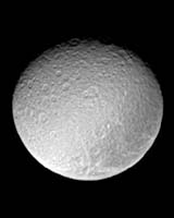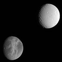 Pasadena CA (JPL) Apr 21, 2005 Cassini offers this lovely comparison between two of Saturn's satellites, Dione and Tethys, which are similar in size but have very different surfaces. Extensive systems of bright fractures carve the surface of Dione (1,118 kilometers, or 695 miles across). The double-pronged feature Carthage Linea points toward the crater Turnus at the nine o'clock position near the terminator, and Palatine Linea runs toward the moon's bottom limb near the five o'clock position. In contrast, the surface of Tethys (1,071 kilometers, or 665 miles across) appears brighter and more heavily cratered. The large crater Penelope is near the eastern limb. The huge rift zone Ithaca Chasma, which is 3 to 5 kilometers (2 to 3 miles) deep and extends for about 2,000 kilometers (1,200 miles) from north to south across Tethys, is hidden in shadow just beyond the terminator. For comparison, the Grand Canyon in Arizona is about 1.5 kilometers (1 mile) deep, and about 450 kilometers (280 miles) long. The image was taken in visible light with the Cassini spacecraft narrow-angle camera on March 7, 2005, at a distance of approximately 1.5 million kilometers (908,000 miles) from Tethys and 1.6 million kilometers (994,000 miles) from Dione. The image scale is 9 kilometers (6 miles) per pixel on Tethys, and 10 kilometers (6 miles) per pixel on Dione.