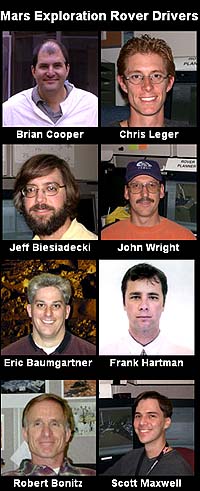 Driving Spirit Versus Opportunity "It's a lot of fun to come to work and drive the rovers on Mars and drive the rover arm, which is a whole other story in itself," said Baumgartner. The rover drivers for the two rovers have had very different experiences due to the difference in terrain at the two sites. "At the Opportunity site, it's like we're driving on snow with little traction on the slopes, but the Spirit site is like monster truck driving with the rocky terrain," laughed Baumgartner. Spirit is on flat, rocky terrain, while Opportunity is in steep terrain with a low distribution of rocks, so the two rover driving teams will be swapping lessons learned when each rover moves to a different location. "If Spirit makes it to Bonneville crater, the rover drivers will have to rely on what we've learned at Meridiani, and once we get out of the crater at Meridiani, we may need to learn how to drive far in a rock-strewn landscape from the Spirit team," said Baumgartner.