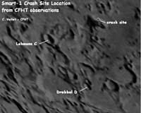 What happened? Dust after the flash From a detailed analysis of the CFHT infrared movie of the variations after the flash, a cloud of ejected material or debris travelling some 80 kilometres in about 130 seconds has been detected by observer Christian Veillet, Principal Investigator for the SMART-1 impact observations at CFHT. "It seems that some ejecta or debris made it across the mountain. This is good news to search for the ejecta blanket" says Foing." We might also see the 'firework' expansion of gas and debris that has bounced after impact from the spacecraft." Some SMART-1 campaign amateurs report that they may have observed the optical flash in their own data, and a possible impact afterglow. "We call for observers to search for the crater and ejecta blankets from SMART-1, in particular using visible or infrared imagery, or even to look at spectroscopic anomalies at the impact site," added Foing. "We also call all observers to send us their reports, thanking them for engaging in the SMART-1 adventure". Community Email This Article Comment On This Article Related Links SMART-1 Lunar Dreams and more Mars News and Information at MarsDaily.com Lunar Dreams and more