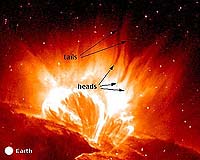 Warwick, UK (SPX) Feb 23, 2005 Researchers at the University of Warwick's Department of Physics have gained insight into the mysterious giant dark "tadpoles" that appear to swim towards the surface of the Sun during solar flares - enormous energy releases happening in the atmosphere of the Sun. The tadpoles - colossal physical structures with dark heads and attendant wiggly tails that seem to swim sunwards against tides of hot matter being thrown away from the Sun during flares - have puzzled astrophysicists for several years, as they are so unlike any other phenomena observed on the Sun. University of Warwick researchers Dr Valery Nakariakov and Dr Erwin Verwichte believe they have managed to understand the physics of this process. They analysed observations obtained with NASA's "Transition Region And Coronal Explorer" (TRACE) space mission and put forward the idea that the wiggles of the tadpoles' tails are huge waves - similar to the flying of flags in the wind - though, these solar wiggles are several times larger than the Earth. The scientists think that the waves are produced by a peculiar physical mechanism known as "negative energy waves", when waves suck energy from the medium they propagate through. The understanding of the wiggles allowed the researchers to conclude that the tadpoles themselves are not material features, but optical illusions, as the solar matter is not falling down but is being continuously thrown upwards. The apparently descending tadpole head marks the falling start point of the matter's upward acceleration This work has just been published this month as a Letter in Astronomy and Astrophysics. An animation of the tadpoles can be seen here. Community Email This Article Comment On This Article Related Links Dr Valery Nakariakov's homepage Dr Erwin Verwichte's homepage SpaceDaily Search SpaceDaily Subscribe To SpaceDaily Express Solar Science News at SpaceDaily