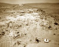 Pasadena CA (SPX) Mar 25, 2008Opportunity completed the first leg of a two-part drive toward an area of scientific interest known as "Gilbert" that involved moving backward in order to continue the drive without running into some unexpectedly deep soil to the rover's right. En route, Opportunity spent two Martian days acquiring compositional data from a rock exposure dubbed "Lyell-Exeter," measured argon gas in the Martian atmosphere, and conducted remote-sensing activities. |