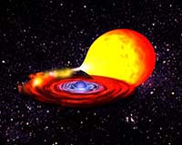 Greenbelt MD (SPX) May 02, 2008 Using observations from NASA's Rossi X-ray Timing Explorer (RXTE), an international team of astronomers has discovered a timing mechanism that allows them to predict exactly when a superdense star will unleash incredibly powerful explosions. "We found a clock that ticks slower and slower, and when it slows down too much, boom! The bomb explodes," says lead author Diego Altamirano of the University of Amsterdam in the Netherlands. The bursts occur on a neutron star, which is the collapsed remnant of a massive star that exploded in a supernova. The neutron star belongs to a binary system that can be described as a ticking time bomb. Hydrogen and helium gas from a companion star spirals onto the neutron star, slowly accumulating on its surface until it heats up to a critical temperature. Suddenly, the hydrogen and helium begin to fuse uncontrollably into heavier elements, igniting a thermonuclear flame that quickly spreads around the entire star. The resulting explosion appears as a bright flash of X-rays. These bursts, which can occur several times per day from the same neutron star, release more energy in just 10 to 100 seconds than our sun radiates in an entire week. Put another way, the energy is equivalent to 100 fifteen-megaton hydrogen bombs exploding simultaneously over each postage-stamp-size patch of the neutron star's surface. Scientists have observed thousands of these X-ray bursts from about 80 different neutron stars. But until now, they had no way to predict when they would occur. The key to this discovery is RXTE, which makes extremely precise timing measurements of rapidly flickering X-ray-emitting objects. As gas gradually builds up on the neutron star's surface, hydrogen and helium atoms sometimes fuse into heavier elements in a stable and almost perfectly repetitive fashion. This mode of fusion produces a nearly regular X-ray signal known as a quasi-periodic oscillation, or QPO for short. Theory predicts that the frequency of the cycle should be about 0.009 cycles per second (9 Millihertz, or one cycle every two minutes). This is very close to the QPO frequency in 4U 1636-53 measured by Altamirano and his colleagues using extensive RXTE observations. But the team also found that the QPO frequency decreased over time from about 12 Millihertz to 8 Millihertz. In a paper published in the January 20 Astrophysical Journal Letters, the authors demonstrate that every time the QPO frequency slowed down to about 8 Millihertz (one cycle per 125 seconds), the neutron star in 4U 1636-53 let loose a powerful X-ray burst. "We are able to predict when these explosions are happening. We have a clock that tells us when the bomb will explode!" says Altamirano. "We do not yet know if this sequence of events means the oscillations cause the explosion, or if they are just telling us the time has come for an outburst. Further observations from RXTE will be essential to figure this out," adds coauthor Michiel van der Klis, who also works at the University of Amsterdam. The same group is now studying more than 50 other neutron stars to see if it can identify similar behavior. The 4U 1636-53 system is located about 20,000 light-years away right near the border between the southern constellations of Ara and Norma. "It's an exciting discovery," says astrophysicist Tod Strohmayer of NASA's Goddard Space Flight Center in Greenbelt, Md. "The QPO frequencies are related to the mass and size of the neutron star, so we may be able to use them to pin down the masses of some neutron stars. It gives us a new tool to study these fascinating objects." Community Email This Article Comment On This Article Related Links Stellar Chemistry, The Universe And All Within It